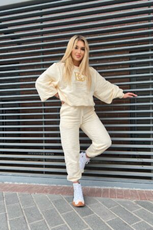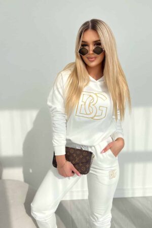 Komplet dresowy BG NEW ORIGINAL z nieocieplanej dzianiny w kolorze ecru. Bluza z kapturem ozdobiona dużym haftowanym złotym logiem marki w konturach. Spodnie posiadają gumkę w pasie oraz sznurek z ozdobnymi zakończeniami. Na lewej kieszeni spodni wyhaftowane złote logo marki w konturach. Spodnie modelujące sylwetkę. Made in Poland.