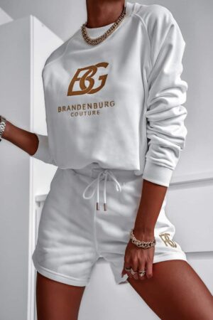 Wysokiej jakości komplet wykonany z dzianiny dresowej. W skład kompletu wchodzi bluza oraz szorty. Bluza wkładana przez głowę, bez kaptura, ozdobiona jest dużym złotym haftem z logo producenta BG Brandenburg Couture. Rękawy i dół bluzy zakończone ściągaczem. Spodenki z wyższym stanem mają wygodne kieszenie oraz ozdobny złoty haft BG. W pasie guma i sznurek do zawiązania. Made in Poland .