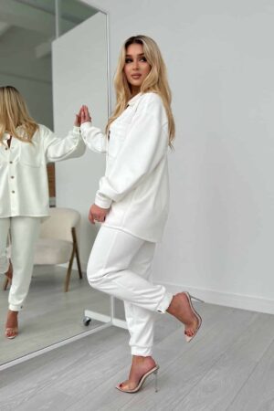 Komplet zamszowy BG MANIA w kolorze ecru. Komplet składa się z koszuli oraz spodni. Koszula zapinana na guziki, dodatkowo posiada kieszenie. Na piersi haft z logo marki. Spodnie posiadają gumkę z w pasie oraz ozdobne guziki przy zapięciach mankietów. W szwach spodni znajdują się kieszonki. Made in Poland .