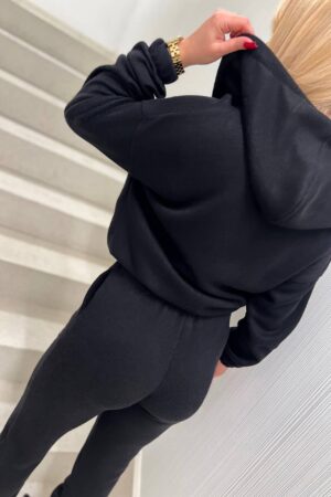 Przepiękny komplet Fia wykonany z dzianiny w kolorze czarnym. Bluza z kapturem ozdobiona haftowanym złotym logiem marki. Spodnie posiadają gumkę w pasie oraz sznurek z ozdobnymi zakończeniami. Po bokach spodni oraz bluzy znajdują się praktyczne kieszenie. Na lewej kieszeni spodni wyhaftowane złote logo marki. Spodnie modelujące sylwetkę. Made in Poland .