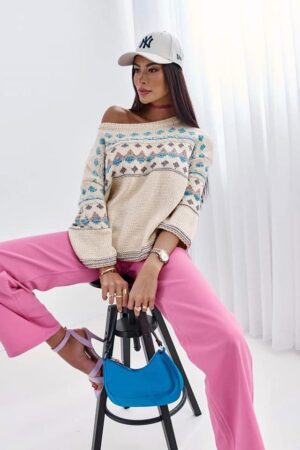 Przepiękny, luźny sweterek Mexi, wykonany z wysokiej jakości przędzy to świetna propozycja dla wielbicielek stylu boho. Charakteru dodają rozszerzane rękawy i ciekawe wzory z błyszczącymi dodatkami. Idealna opcja na nadchodzący sezon. Made in Poland.