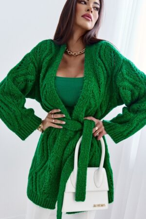 Wyjątkowy, mięsisty kardigan Livia, wykonany na polskiej dziewiarni z wysokiej jakości przędzy. Ażurowy splot dodaje uroku i oryginalności. Dodatkowym atutem jest pasek do przewiązania w talii.