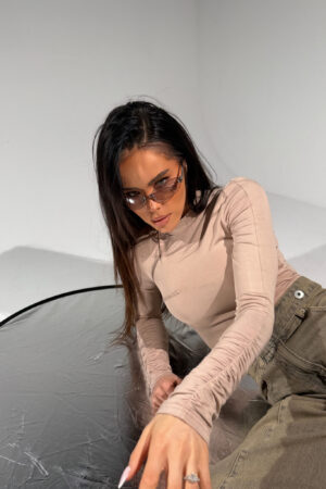 Dopasowane body wykonane z miękkiej, elastycznej wiskozy, która delikatnie przylega do ciała i pięknie podkreśla sylwetkę. Fason z długim rękawem zakończonym marszczeniem oraz zabudowanym dekoltem dodaje elegancji i minimalizmu. Na przodzie haftowane logo lamanuel. Dół na stringi – niewidoczny pod ubraniem, komfortowy i praktyczny w noszeniu. Idealna baza do stylizacji codziennych i bardziej wyjściowych – body, które zrobi robotę zawsze i wszędzie.
