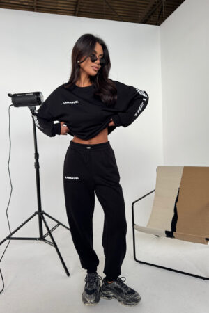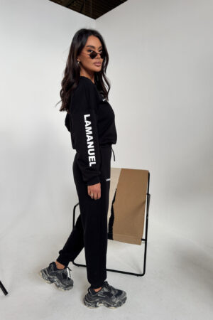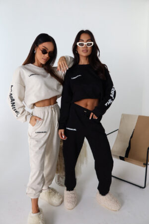 Spodnie dresowej, wysoki stan, elastyczna guma w pasie, ściągacze przy kostkach. Swobodna, lekko zwężana nogawka. Na przodzie subtelny nadruk LAMANUEL. Świetnie wygląda solo i w komplecie .