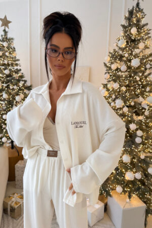 Miękka jak chmurka koszulo-bluza o prążkowanej strukturze, która otula sylwetkę przyjemnym ciepłem. Oversize’owy krój, długi rękaw i delikatny kołnierzyk tworzą idealne połączenie komfortu i elegancji. Łączy domowy komfort z miejskim stylem. Nie tylko jako luksusowa alternatywa dla piżamy, ale też jako stylowy wybór na co dzień – do sneakersów, botków czy w wersji narzutki na top. To nie jest zwykła bluza – to element garderoby, który robi klimat.