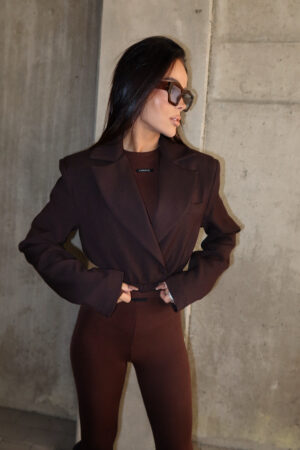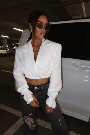Ta marynarka robi całą stylówkę. Oversize’owy krój w wersji cropped i taliowanie gumką dają idealny balans między elegancją a streetem. Ale to rękawy są tu gwiazdą – szerokie, zapięciem na guziki. Możesz spiąć je od góry, od dołu albo zostawić luźno – za każdym razem dają zupełnie inny efekt.