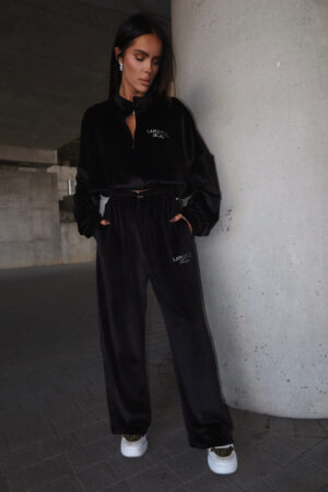 Luźne spodnie z wysokim stanem, wykonane z miękkiego weluru. Elastyczna talia z troczkiem gwarantuje wygodę i dopasowanie niezależnie od typu figury. Model one size, który świetnie leży na różnych sylwetkach — od smukłych po bardziej krągłe. Tworzą idealny zestaw z pasującą bluzą.
