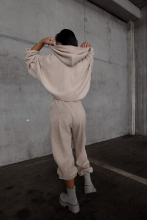 Miękka, prążkowana bluza z kapturem i zamkiem na całej długości to połączenie wygody i stylu. Oversize’owy krój z lekko opuszczoną linią ramion nadaje jej miejskiego luzu, a haftowane logo subtelnie podkreśla charakter marki. Świetnie sprawdza się solo lub jako komplet.