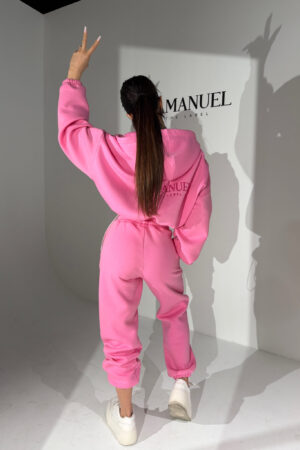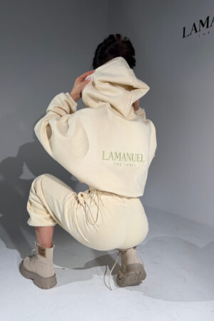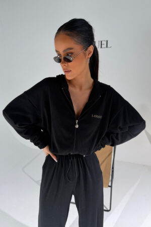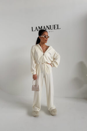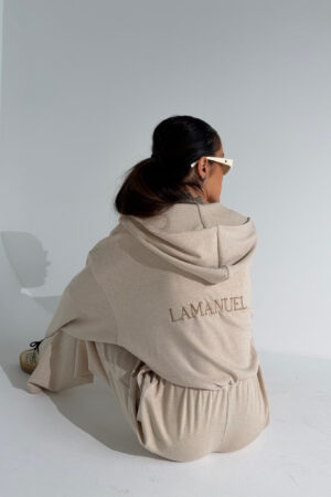 Kombinezon z przyjemnego w dotyku rayonu o lejącej, cięższej strukturze, która pięknie układa się na sylwetce i dodaje całości premium charakteru. Góra zapinana na suwak, z kapturem i długim rękawem zakończonym gumką. W talii elastyczny gumosznurek z możliwością regulacji, który podkreśla proporcje i pozwala dopasować fason do figury. Z przodu i z tyłu wyhaftowane logo lamanuel – subtelne, ale wyraziste. Świetna propozycja dla klientek szukających komfortu w dopracowanej, nowoczesnej formie.