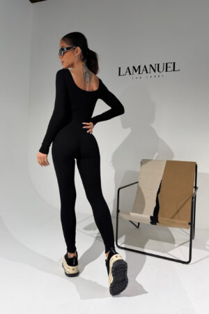Kombinezon z prążkowanej dzianiny, która perfekcyjnie dopasowuje się do sylwetki i zapewnia maksymalną elastyczność. Długie rękawy, głęboki dekolt z przodu i z tyłu oraz przedłużony krój nogawki podkreślają proporcje i wydłużają optycznie ciało. Materiał jest miękki, wygodny i świetnie układa się na każdej figurze. Na przodzie subtelna metka lamanuel. Idealny do noszenia solo lub w zestawie z oversize’ową marynarką czy sportową kurtką – kobieco, nowocześnie i bez wysiłku.