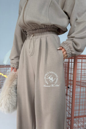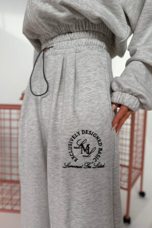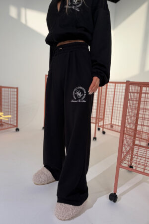 Wysoki stan, elastyczna guma i cienki sznurek z metalowym wykończeniem. Nogawka szeroka, długa, prowadzona prosto. Materiał lekko pracuje w ruchu, bez efektu obciążenia. Drobne zakładki w pasie nadają formę w biodrach. Duży haft na jednej nogawce – spójny z bluzą, ale działa też osobno. Klasyczny dres z wykończeniem, które robi różnicę.