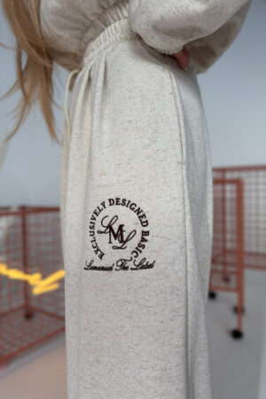 Model oparty na szerokiej, prostej nogawce z wydłużoną linią. Dzianina pętelkowa – miękka, ale stabilna. W pasie elastyczna guma i sznurek do regulacji. Boczna taśma z powtarzalnym logo w odcieniu bazowym. Wykończenie bez ściągaczy. Forma inspirowana sylwetką garniturową, przeniesiona na codzienny materiał. Spodnie, które można nosić jak dres, ale wyglądają jak przemyślany element stylizacji.