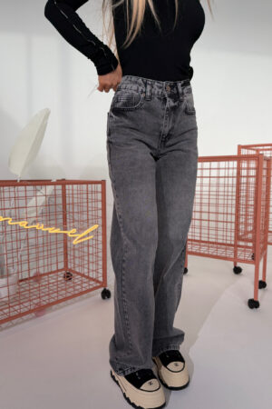 Fason z wysokim stanem i prostą, lekko zwężaną nogawką. Denim bez elastanu – klasyczny, z delikatnie sztywnym chwytem, który pracuje z czasem. Miejscowy efekt sprania w okolicy pasa, kieszeni i wewnętrznej linii ud – podkreśla konstrukcję i wydobywa linię bioder.