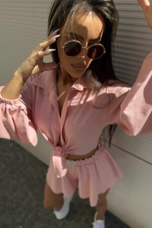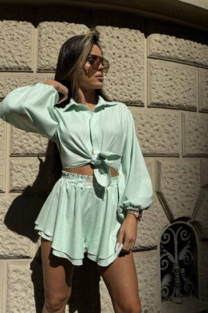 Dwuczęściowy damski komplet to harmonijne połączenie elegancji i komfortu. Koszula z bufiastymi rękawami z falbanką dodaje stylu i romantycznego uroku, podczas gdy wiązanie w talii podkreśla kobiecą sylwetkę. Wykonana z wysokiej jakości materiałów, gwarantuje wygodę noszenia przez cały dzień. Spodenki uzupełniają całość, tworząc zgraną stylizację idealną na różne okazje. Doskonałe na letnie dni, spotkania ze znajomymi czy wieczorne wyjścia. Ten komplet to nie tylko wybór modowy, ale także praktyczny, który z pewnością przyciągnie spojrzenia i podkreśli indywidualny styl noszącej. Made in Poland