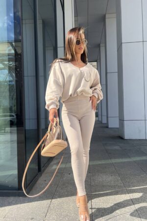 Idealny na jesień komplet damski składający się z bluzy i ponadczasowych legginsów. Bluza bez kaptura z dekoltem w literkę V jest klasyką, która nigdy nie wychodzi z mody. Ten subtelny detal podkreśla szyję i dodaje elegancji całości. Wykonana z miękkiego i przyjemnego w dotyku materiału, bluza zapewnia poczucie wygody i swobody ruchów. Idealnie nadaje się na różne okazje – od casualowych spotkań po bardziej formalne wyjścia. Legginsy w prążek są idealnym uzupełnieniem tego kompletu. Elastyczny materiał legginsów zapewnia doskonałe dopasowanie do sylwetki. Podkreślają one nogi, dodając im zgrabności i wydłużając sylwetkę. Made in Poland .