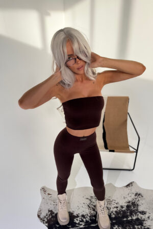 Komplet z prążkowanej dzianiny, który łączy wygodę z dopracowaną prostotą. Top bez ramiączek i legginsy z wysokim stanem tworzą zestaw, który idealnie układa się na sylwetce i sprawdza się zarówno w domu, jak i poza nim. Elastyczny materiał pracuje z ciałem, a minimalistyczne metki z logo dodają całości spójności i charakteru. Nonszalancki, ale przemyślany – dokładnie taki, jak lubimy.