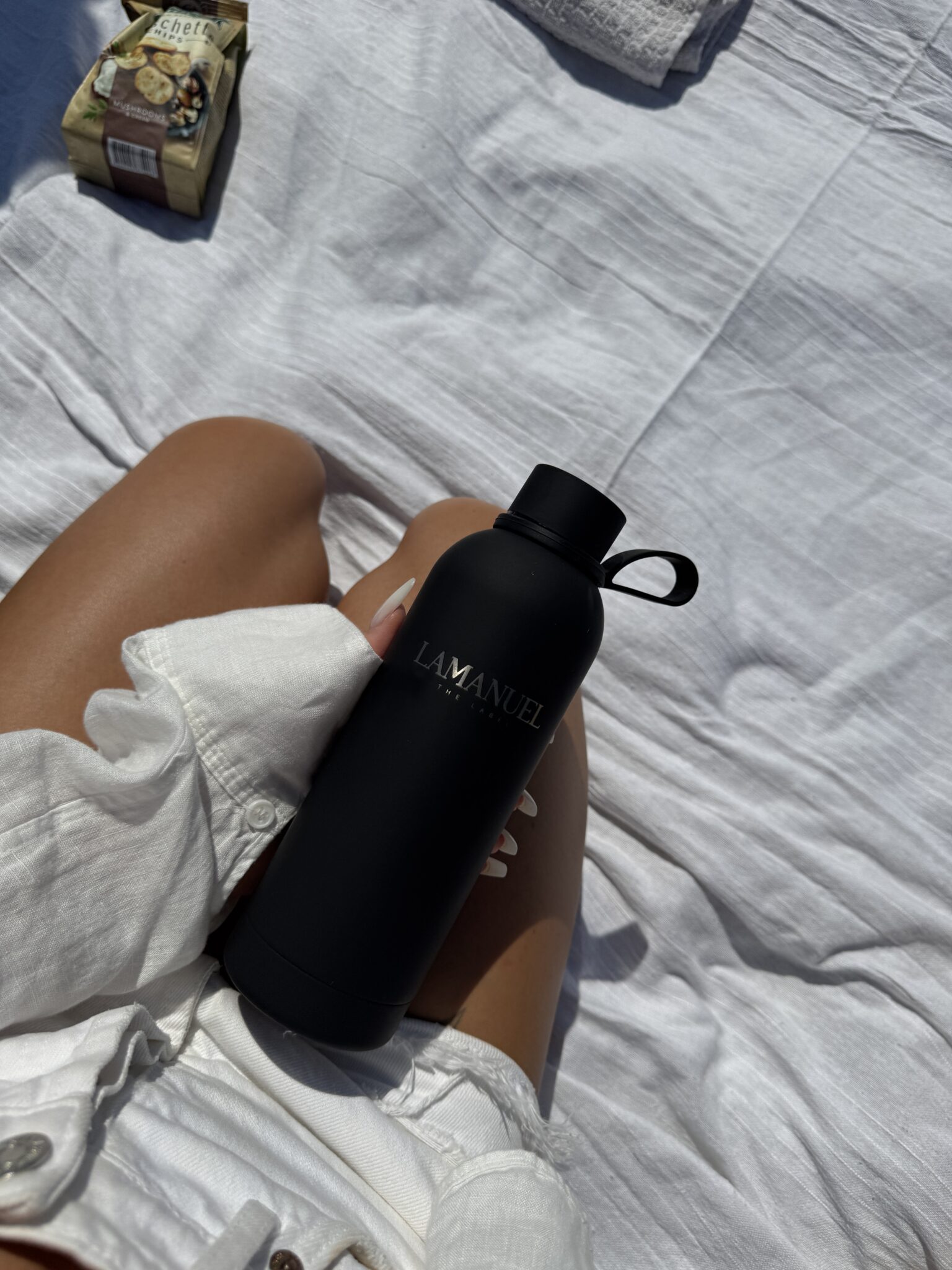 Dwuścienna butelka z izolacją próżniową z recyklingowanej stali nierdzewnej (90% z recyklingowanej stali nierdzewnej i 10% ze stali nierdzewnej) z gumowym wykończeniem i silikonowym uchwytem. Pojemność: 500 ml.