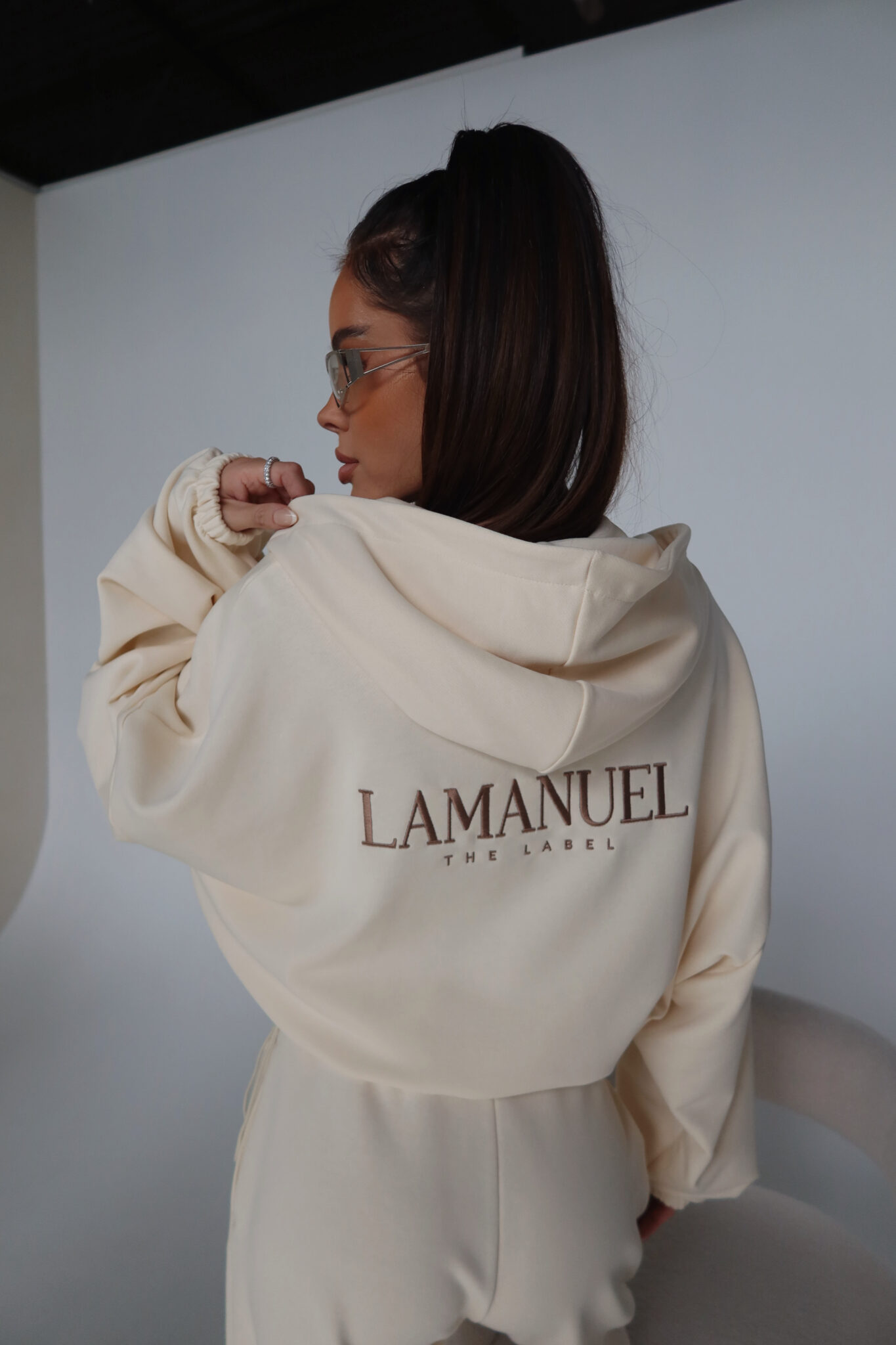 Bluza o luźnym kroju zapinana na suwak z kapturem i wszytym ściągaczem na dole, który umożliwia regulację szerokości i podkreślenie talii. Rękawy szerokie, zakończone delikatną gumką. Na piersi oraz na plecach znajduje się wyraziste logo LAMANUEL, które nadaje całości charakteru. Model wykonany z miękkiej, przyjemnej w dotyku dzianiny, idealny na co dzień i w podróży. Połącz je ze spodniami BASIC, aby mieć stylizację w całości. Bluza pasuje od rozmiaru XS do XXL.