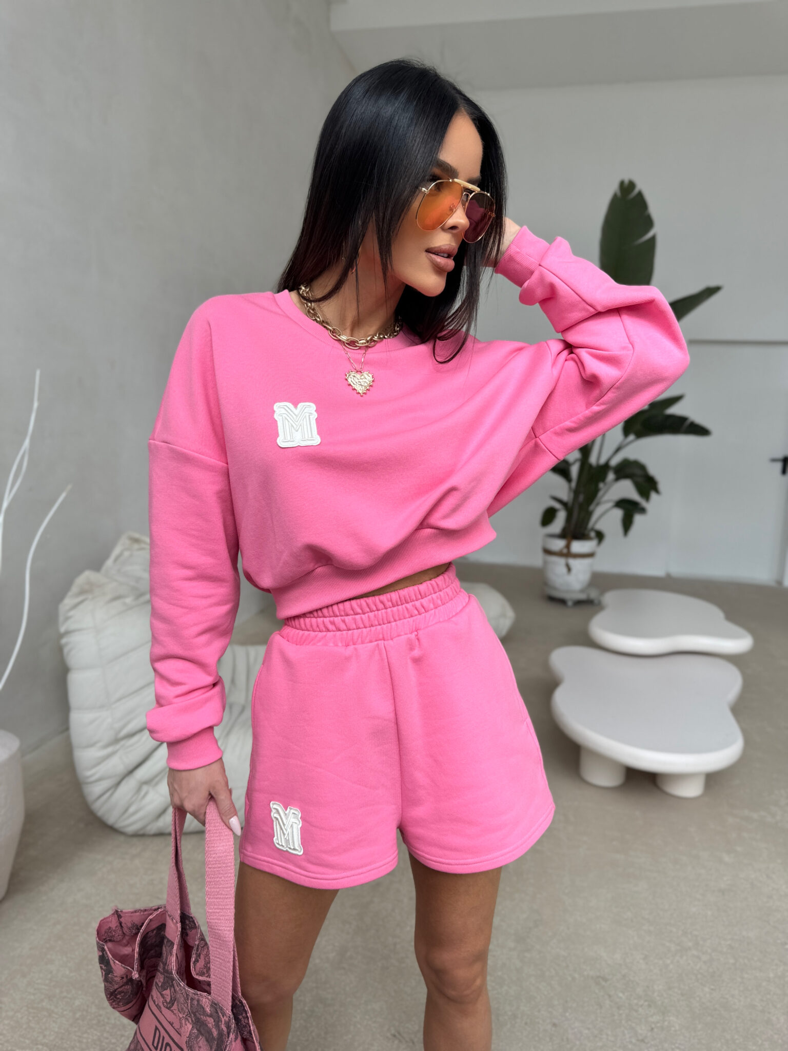 Bluza damska o luźnym, komfortowym kroju wykonana z miękkiej dzianiny. Model posiada obniżoną linię ramion i klasyczny ściągacz przy rękawach oraz u dołu. Na piersi znajduje się wypukłe haftowane logo marki w formie litery M. Idealna do zestawienia z dopasowanymi spodenkami lub jeansami, sprawdzi się zarówno w codziennych, jak i sportowych stylizacjach.
