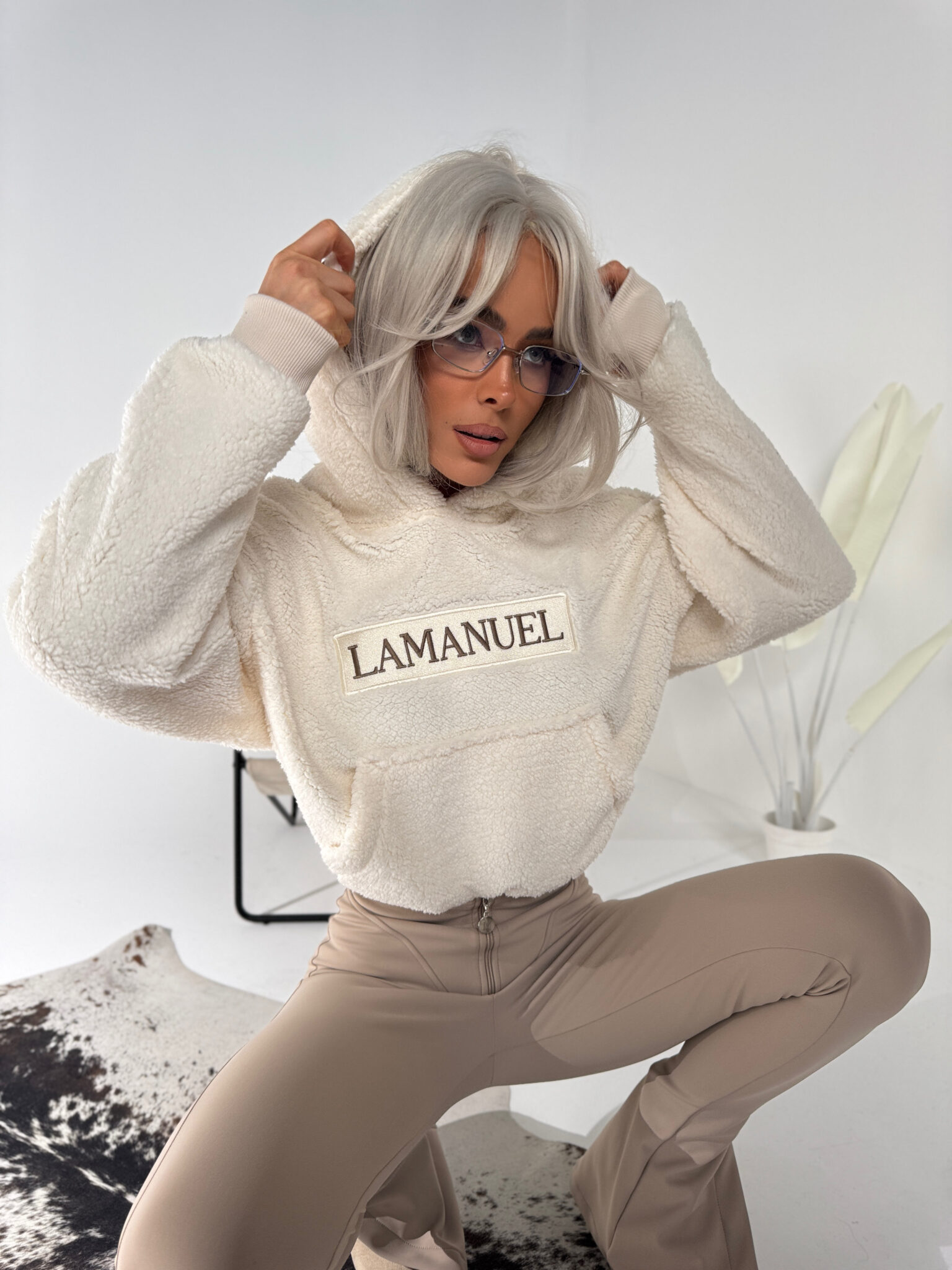 Bluza z miękkiego baranka, która otula jak koc i wygląda tak, że nie chcesz jej zdejmować. Oversize’owy krój daje luz, a naszywka z logo na przodzie dodaje charakteru – nie za głośno, ale konkretnie. Kieszeń typu kangur to klasyk, który tu gra nie tylko praktycznie, ale też stylowo. To bluza, którą wrzucasz na siebie z rana i nagle dzień staje się przyjemniejszy.