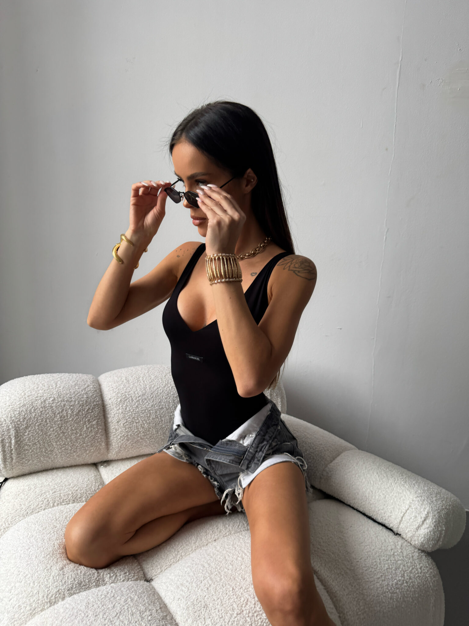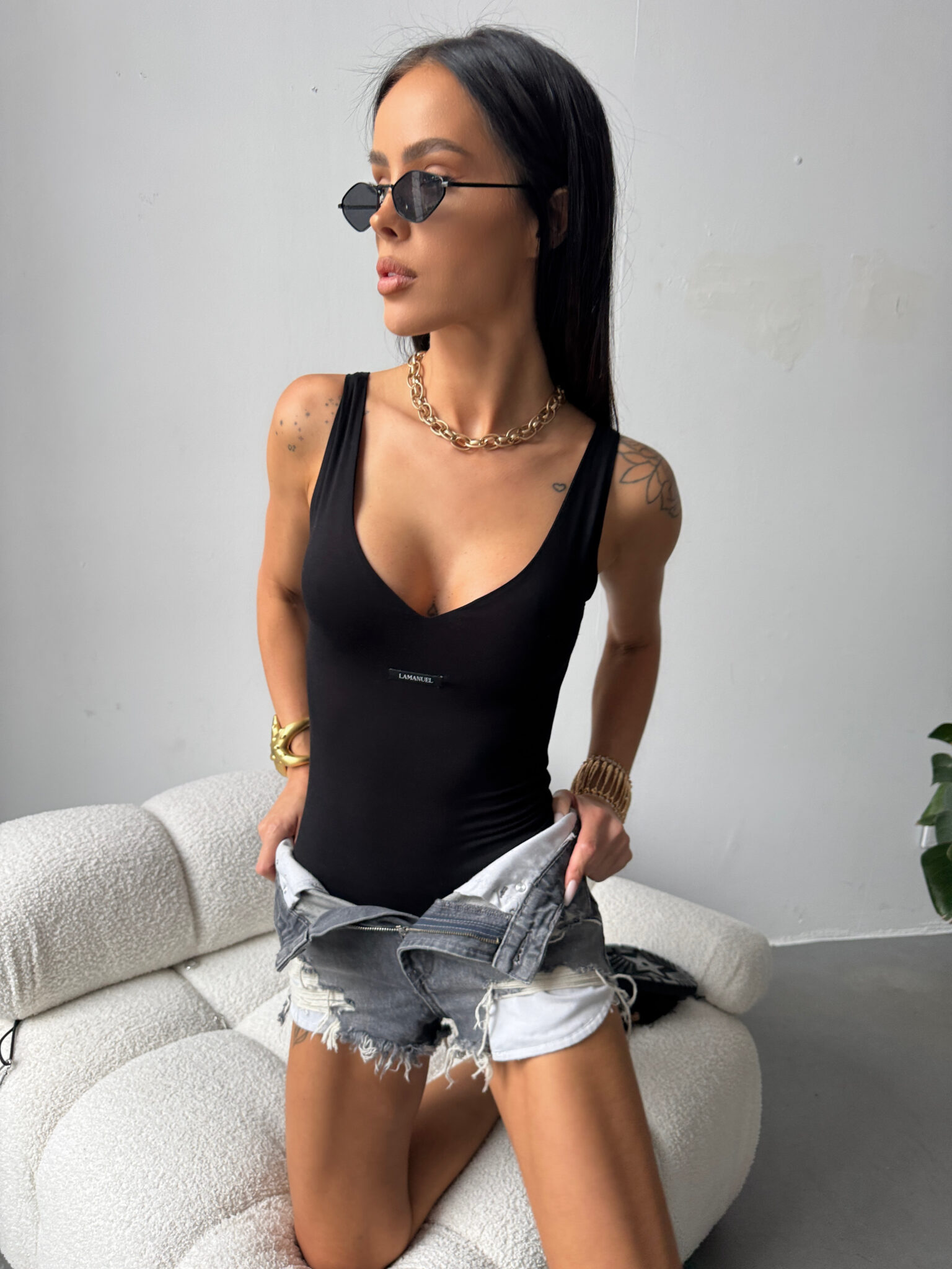 Body z głębokim dekoltem wykonane z podwójnej warstwy elastycznego materiału, zapewniającej komfort i dopasowanie do sylwetki. Model zapinany na haftki w dolnej części. Minimalistyczna metka z logo na przodzie. Idealne jako baza wielu stylizacji, zarówno codziennych, jak i bardziej eleganckich.