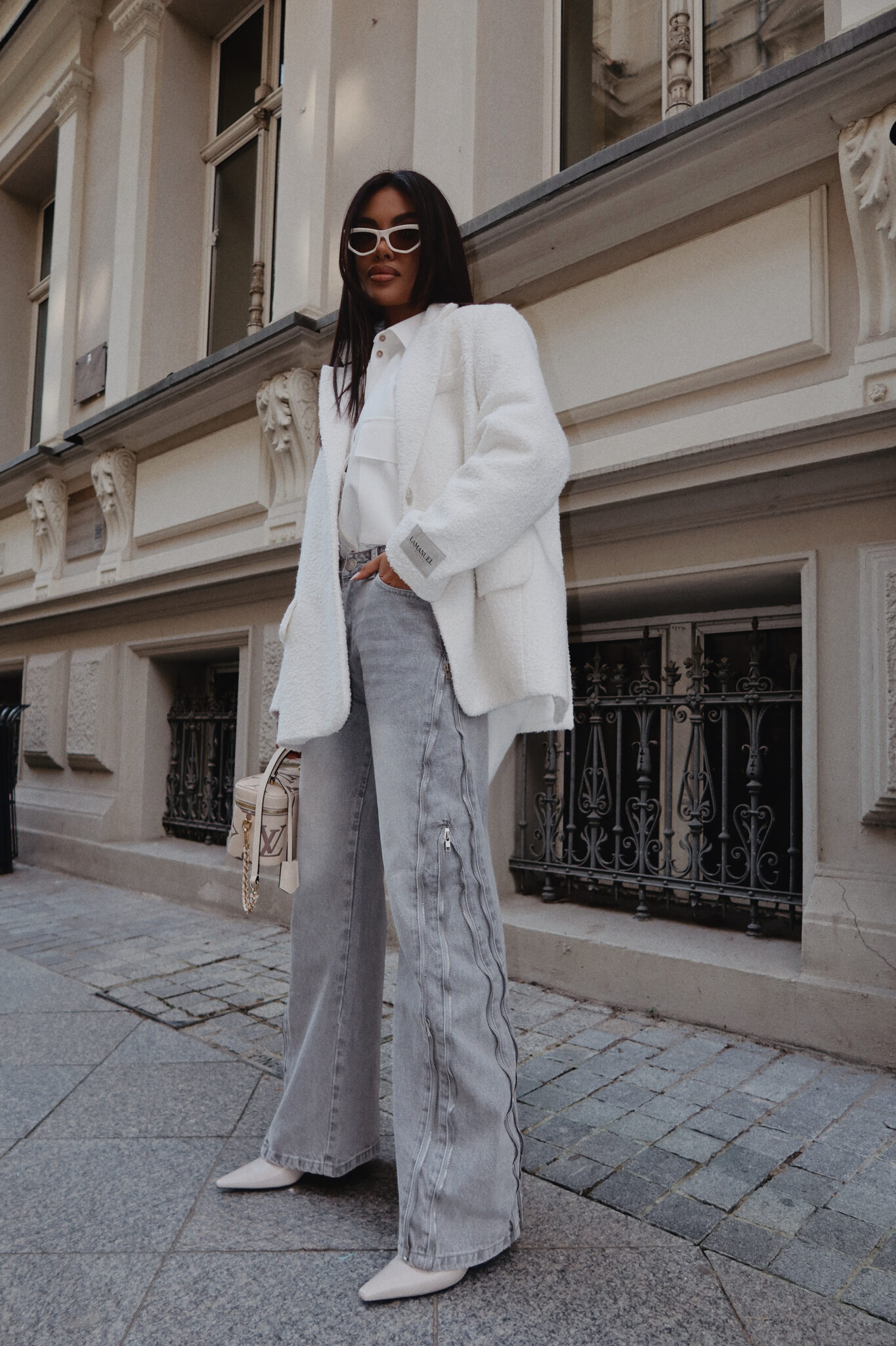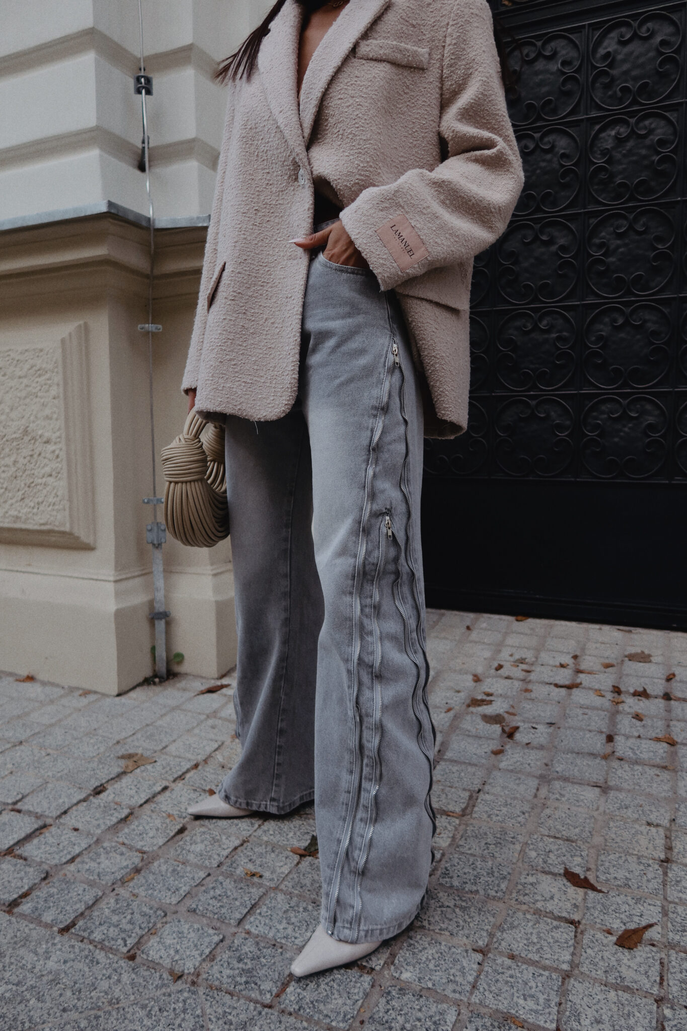 Jeansy, które nie potrzebują zbędnych dodatków, by robić wrażenie. Surowe przeszycia i suwakowe detale dodają im wyrazistości i bezkompromisowego klimatu. Nogawki są szerokie, ale dzięki suwakom możesz je dopasować do siebie – zwężając lub prostując w zależności od nastroju i stylówki. Klasyczny denim w nowoczesnym wydaniu, który gra tu pierwsze skrzypce. Noś je z marynarką, topem albo miękkim swetrem – wszystko zależy od Ciebie.