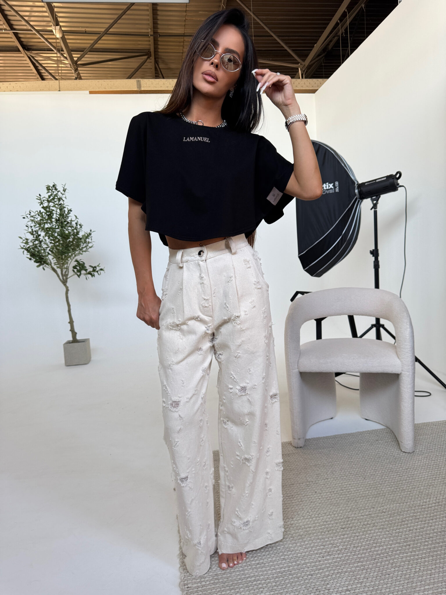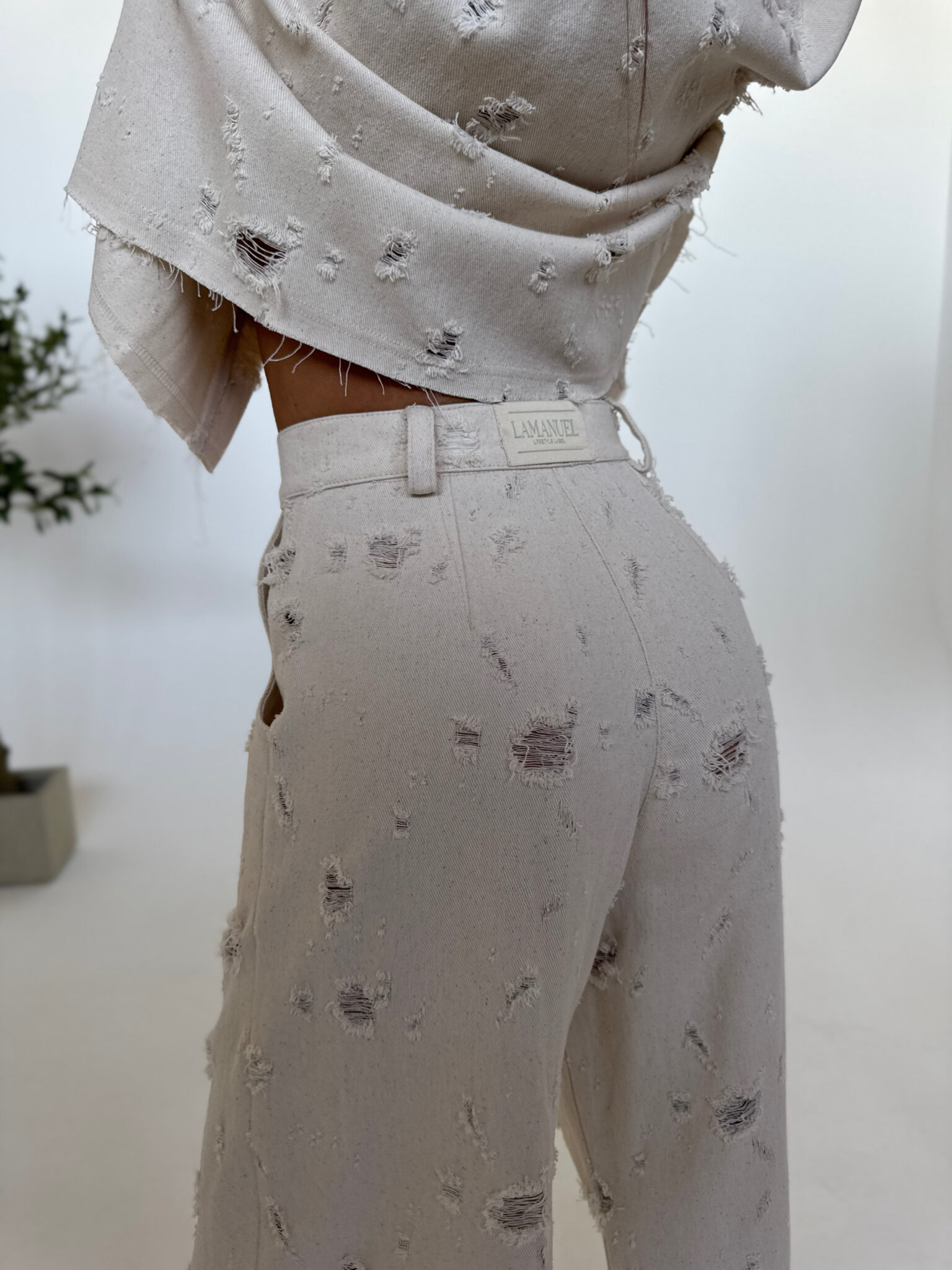 Jeansy o swobodnym, baggy kroju, który łączy luz streetwearu z dopracowanym wykończeniem. Wykonane z miękkiego denimu z wyraźną strukturą, z celowo postarzanymi przetarciami rozmieszczonymi nieregularnie na całej długości. Wysoki stan pięknie podkreśla talię, a klasyczne zapięcie na suwak i guzik zapewnia wygodę noszenia. Z tyłu naszyta metka LAMANUEL podkreśla charakter linii premium. Idealne do casualowych stylizacji – zarówno z krótkim topem, jak i luźną koszulą.