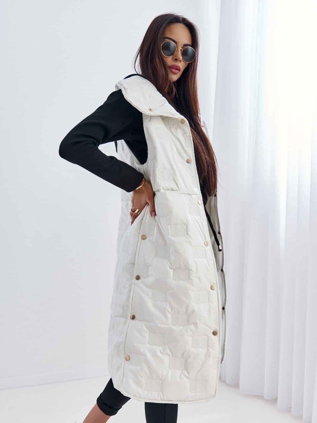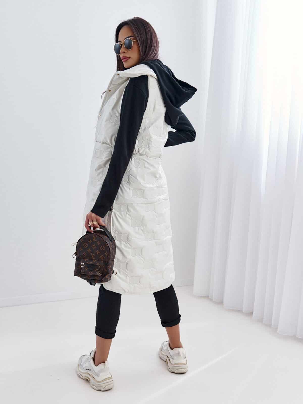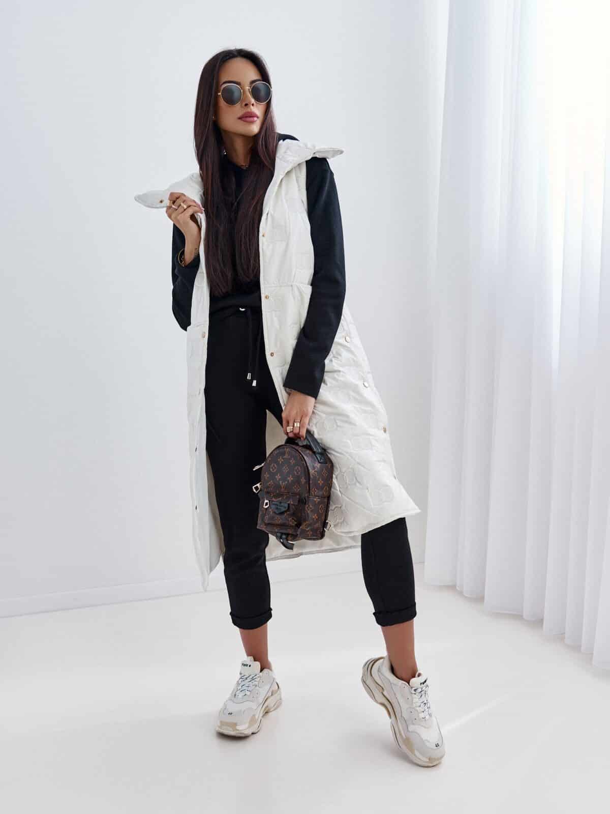 Genialna, pikowana kamizelka Sima o modnej długości. Całość zdobią ciekawe wzory. Na przodzie i po bokach znajdują się kontrastujące napy, dzięki którym można regulować szerokość rozcięć. Dodatkowym atutem jest kołnierzyk u góry. Made in Poland.