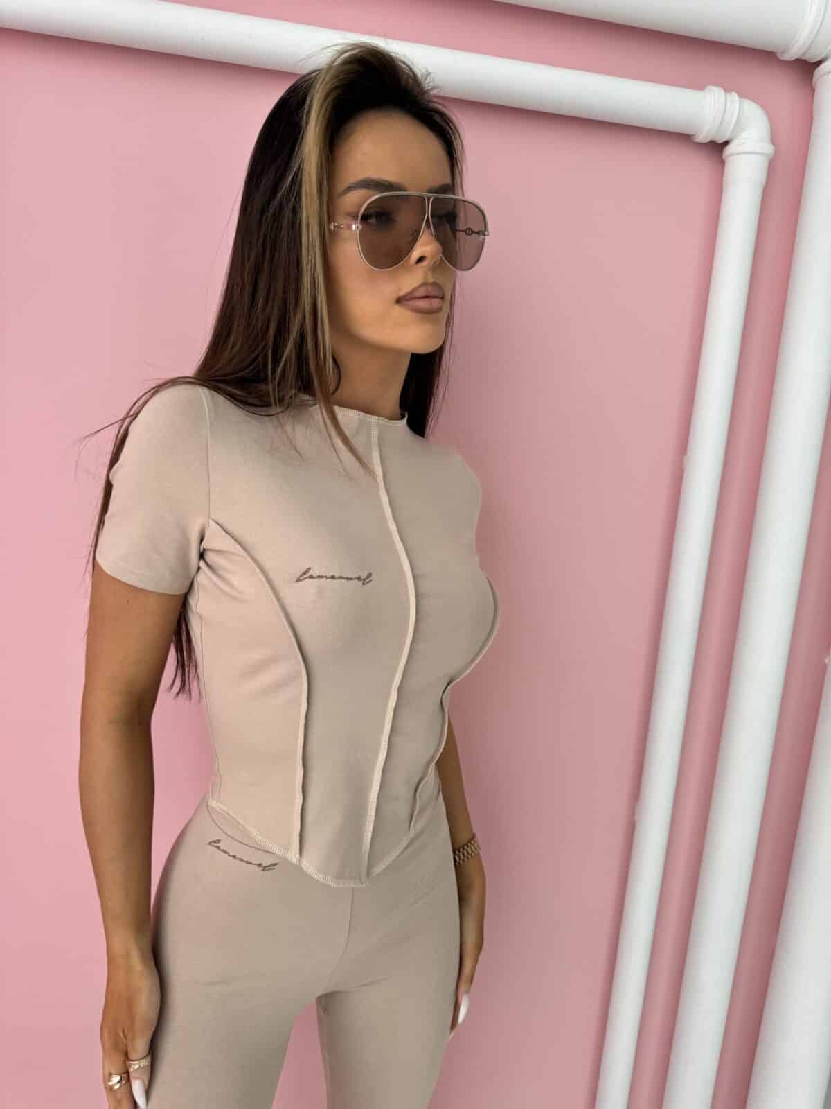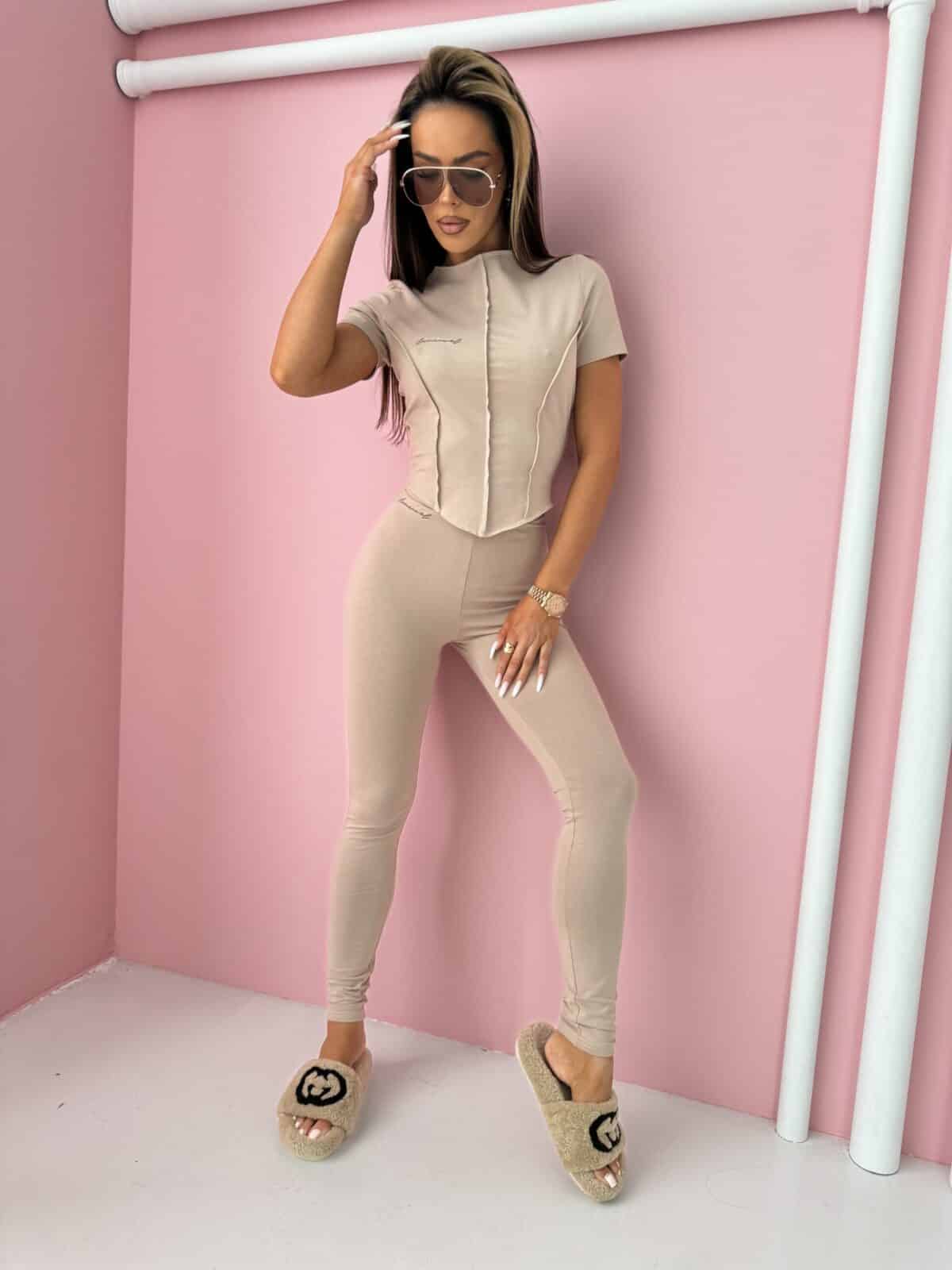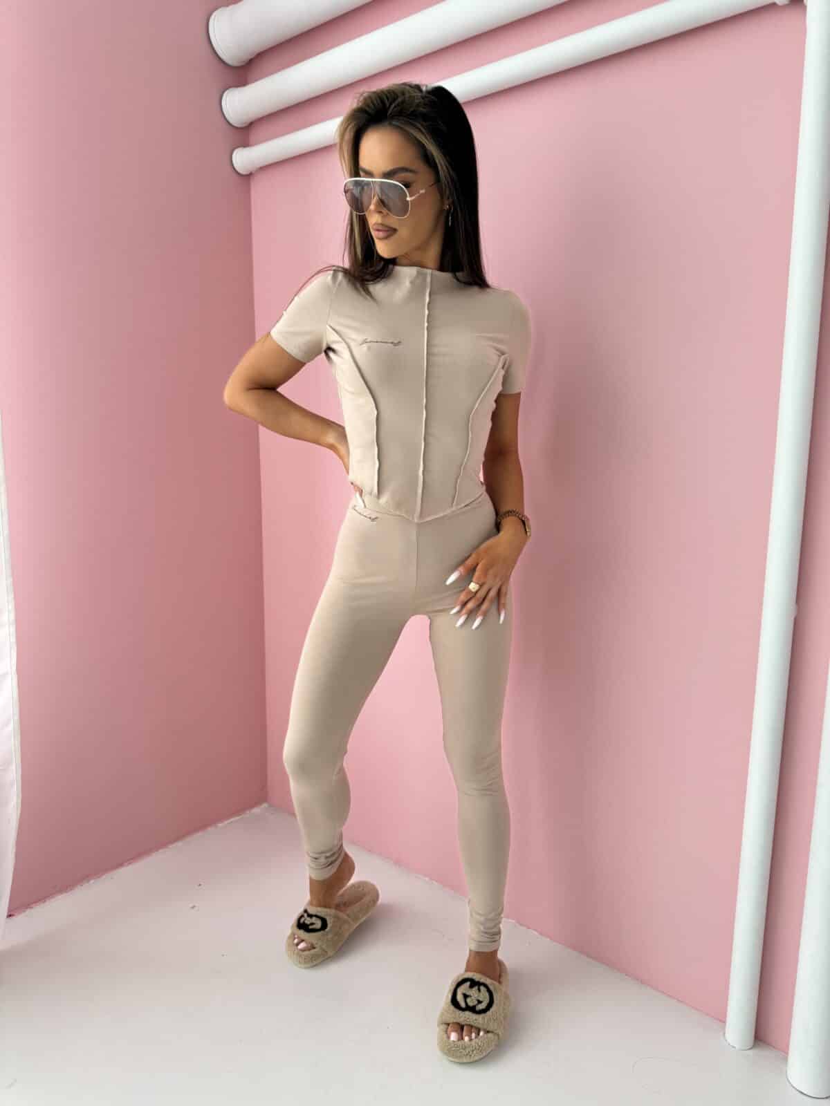 Set damski składający się z koszulki z krótkim rękawem i dopasowanych legginsów. Ten zestaw prezentuje się nie tylko stylowo, ale również gwarantuje wygodę na każdym etapie dnia. Koszulka z krótkim rękawem cechuje się przeszyciami, które nie tylko nadają jej unikalny charakter, ale także podkreślają kobiecą sylwetkę. Dopasowany krój sprawia, że koszulka idealnie układa się na ciele, jednocześnie zapewniając swobodę ruchów. Legginsy z tego kompletu harmonijnie współgrają z koszulką. Ich dopasowany fason podkreśla krągłości sylwetki, jednocześnie zapewniając wygodę noszenia. Elastyczny nieco podwyższony pas gwarantuje, że legginsy będą doskonale trzymały się ciała, nie krępując ruchów. Made in Poland .