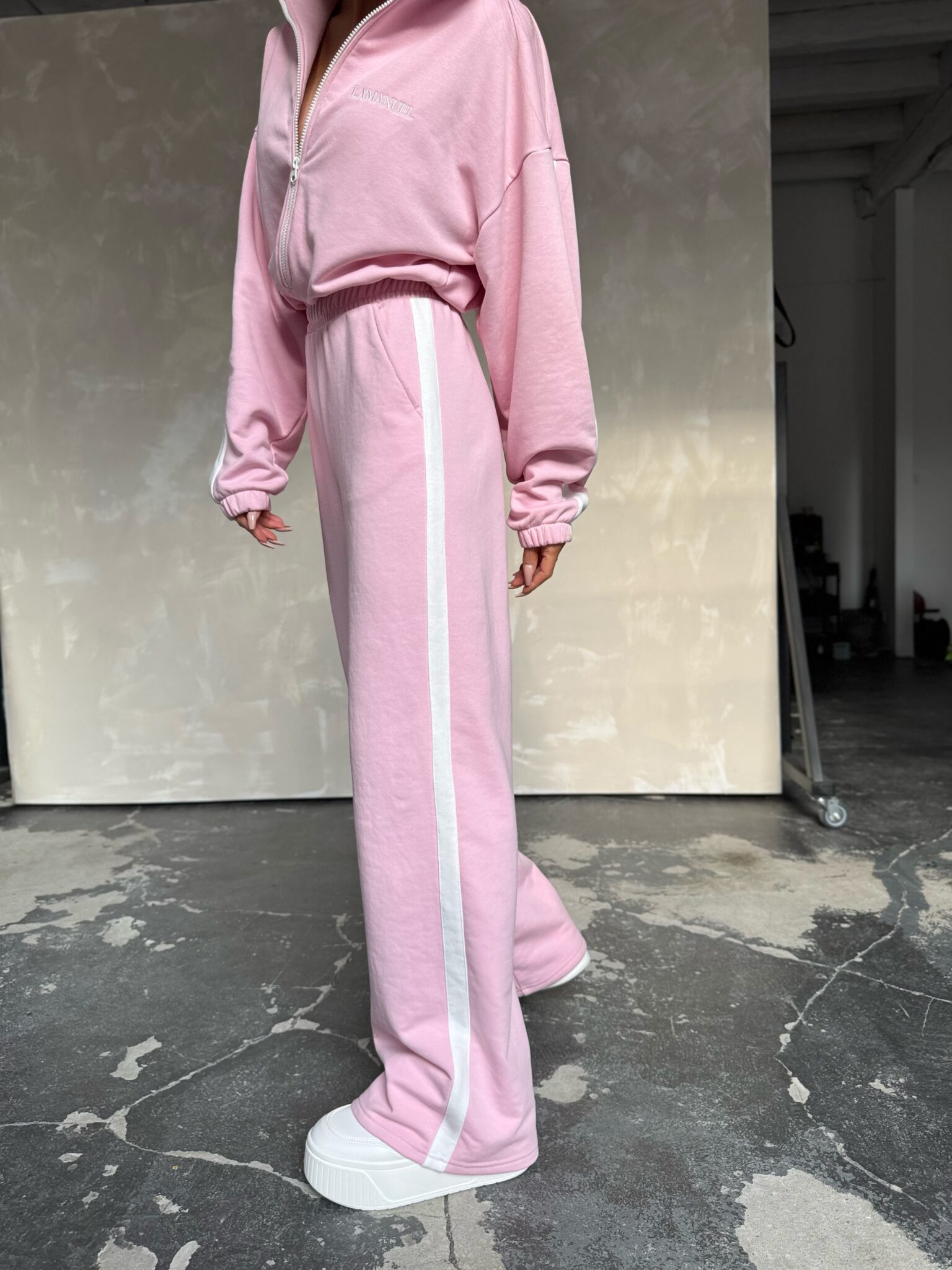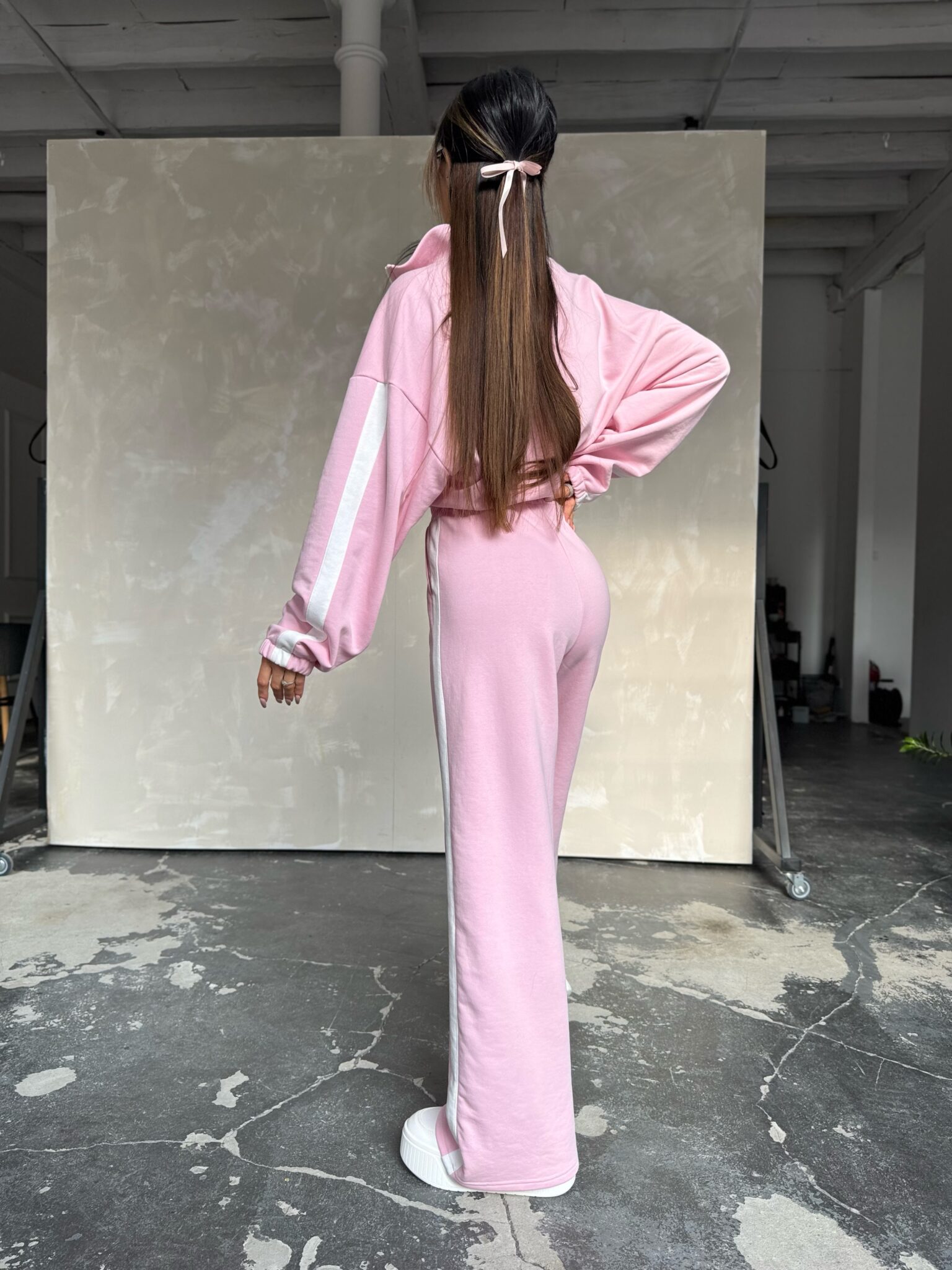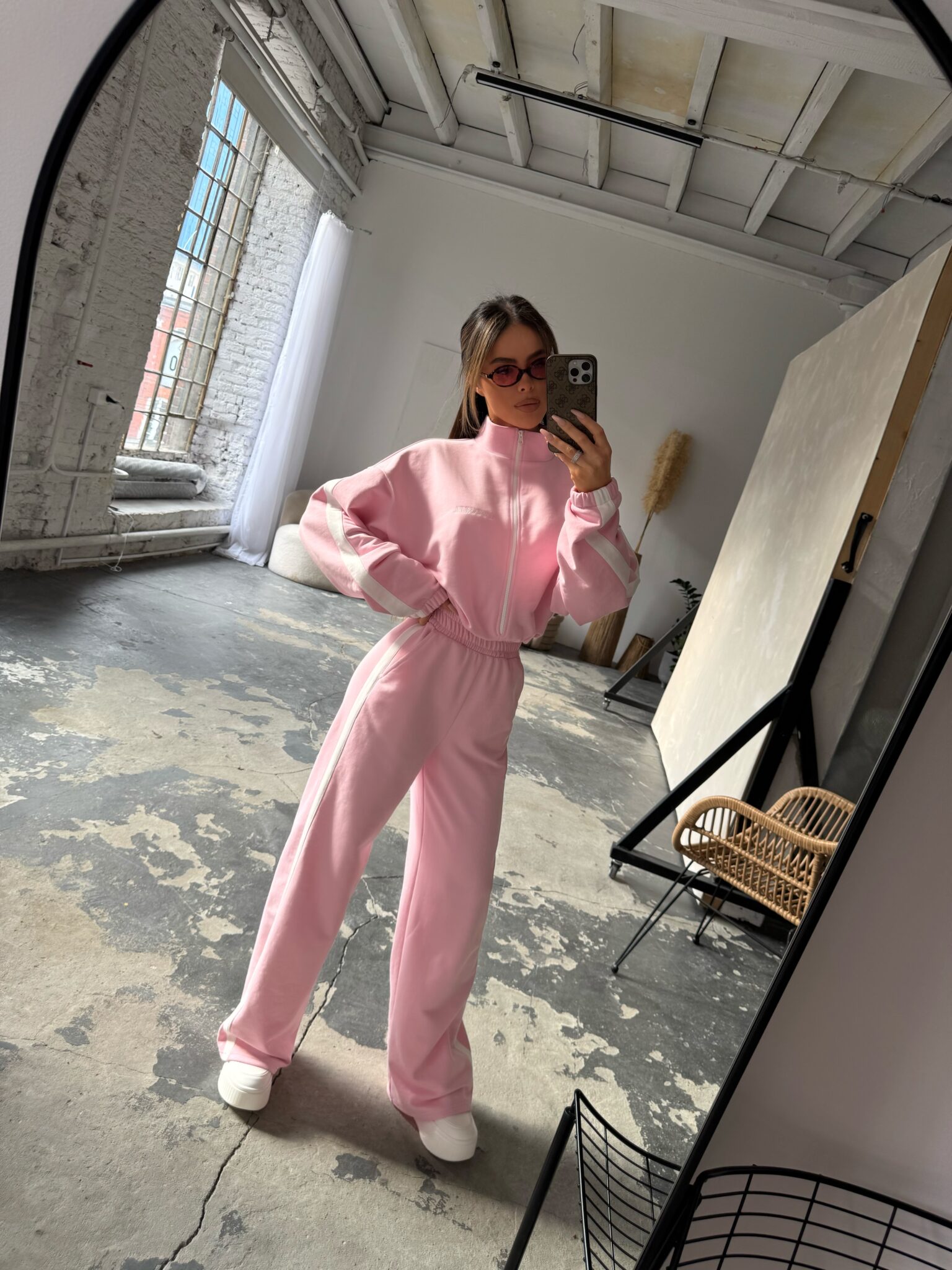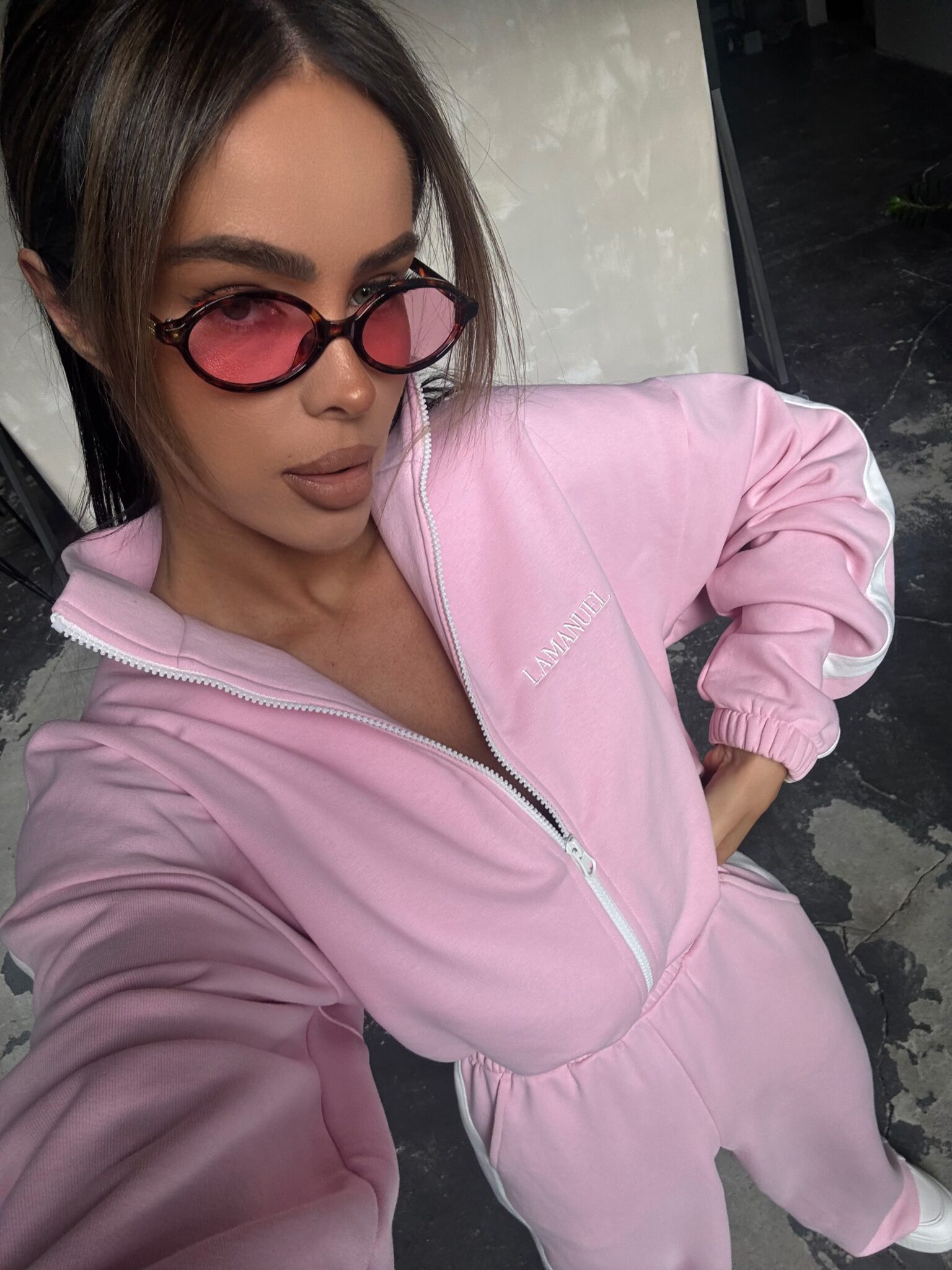 Stylowy design łączy sportową elegancję z subtelnym logo na bluzie. Materiał jest miękki i przyjemny w dotyku, co sprawia, że kombinezon doskonale sprawdzi się na każdą porę roku. Oversize’owy krój dodaje luzu i nowoczesnego wyglądu, a szerokie nogawki z lampasami optycznie wydłużają sylwetkę. Dzięki zamkowi pod szyją można regulować głębokość dekoltu, a elastyczny pas zapewnia idealne dopasowanie.