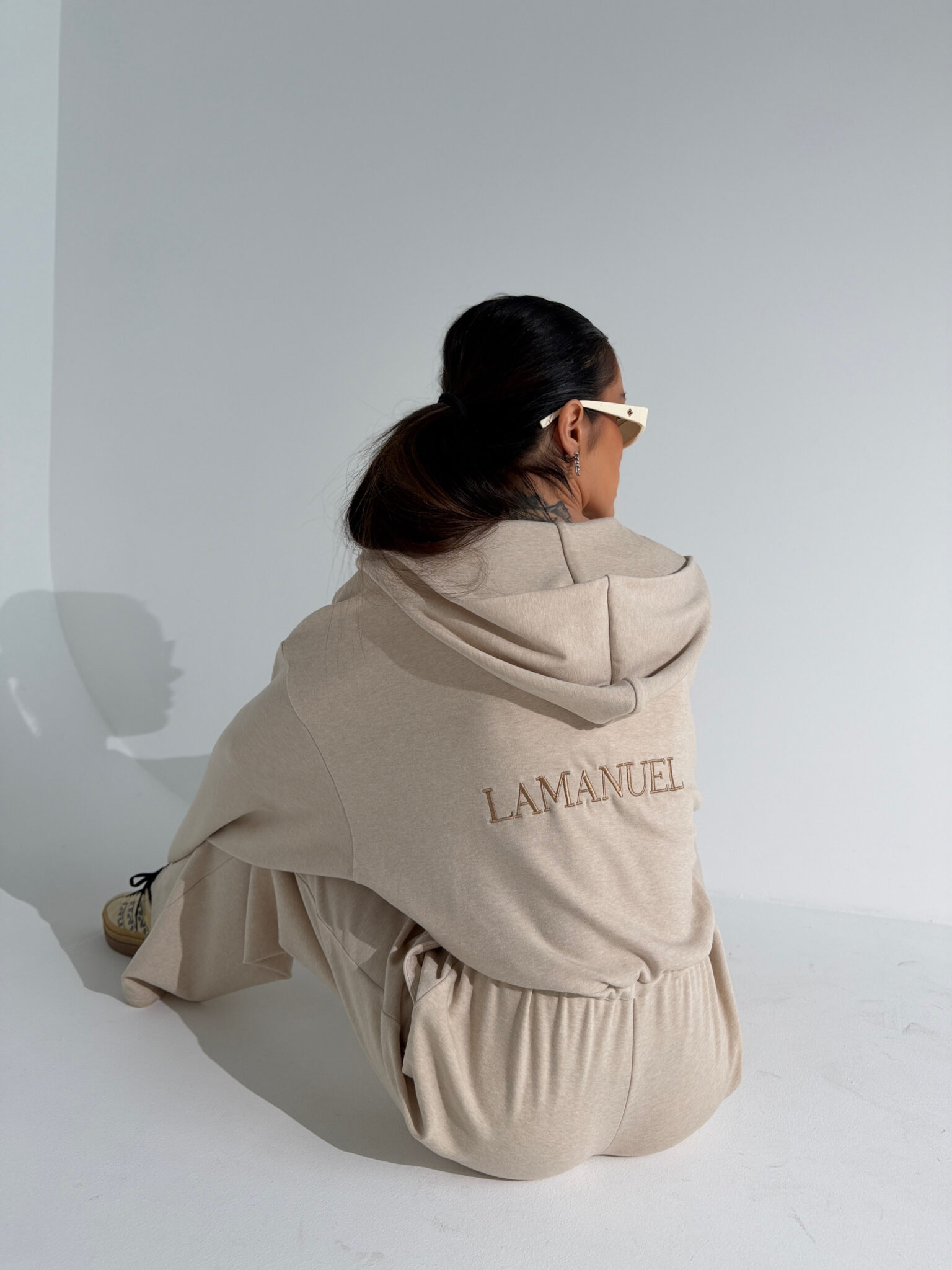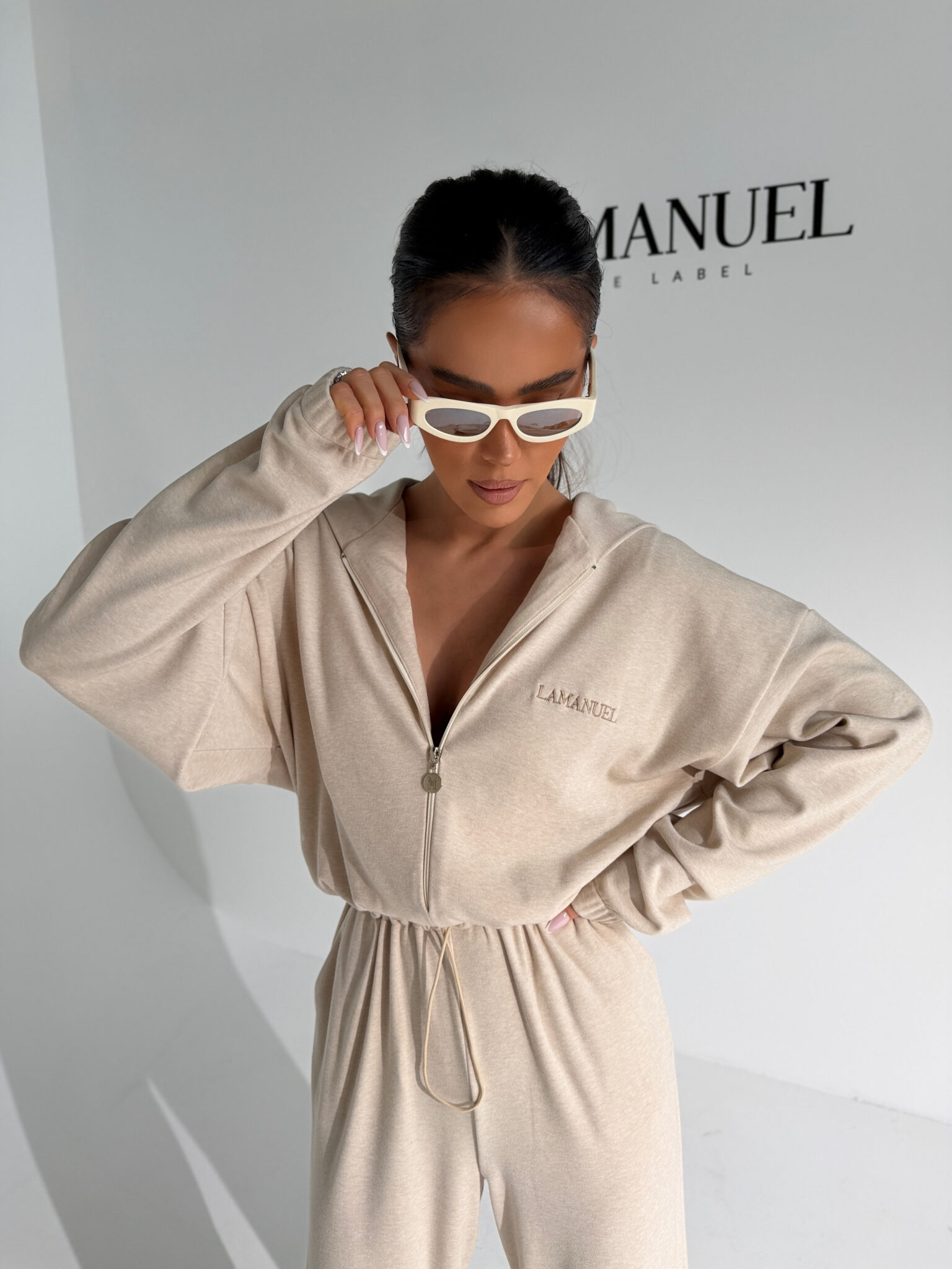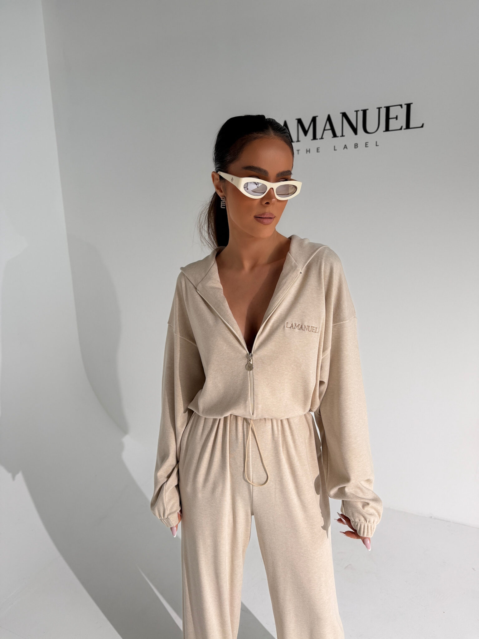 Kombinezon z przyjemnego w dotyku rayonu o lejącej, cięższej strukturze, która pięknie układa się na sylwetce i dodaje całości premium charakteru. Góra zapinana na suwak, z kapturem i długim rękawem zakończonym gumką. W talii elastyczny gumosznurek z możliwością regulacji, który podkreśla proporcje i pozwala dopasować fason do figury. Z przodu i z tyłu wyhaftowane logo lamanuel – subtelne, ale wyraziste. Świetna propozycja dla klientek szukających komfortu w dopracowanej, nowoczesnej formie.