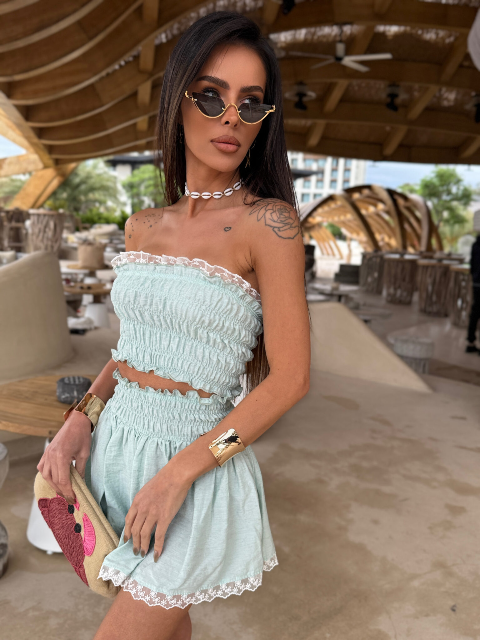 Letni komplet wykonany z lekkiego, przewiewnego materiału, składający się z topu bez ramiączek oraz krótkiej spódniczki. Całość uszyta na elastycznych gumoniciach, które tworzą efektowne marszczenia i gwarantują idealne dopasowanie do sylwetki. Spódniczka i top wykończone delikatną koronką dodają całości subtelności i kobiecego uroku. Stylowy zestaw idealny na ciepłe dni, wakacyjne wyjazdy i letnie spacery. Produkt mocno uciągliwy.