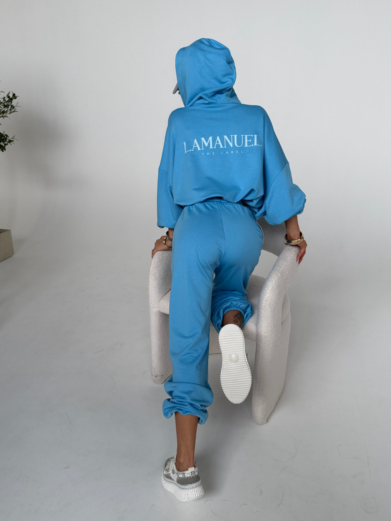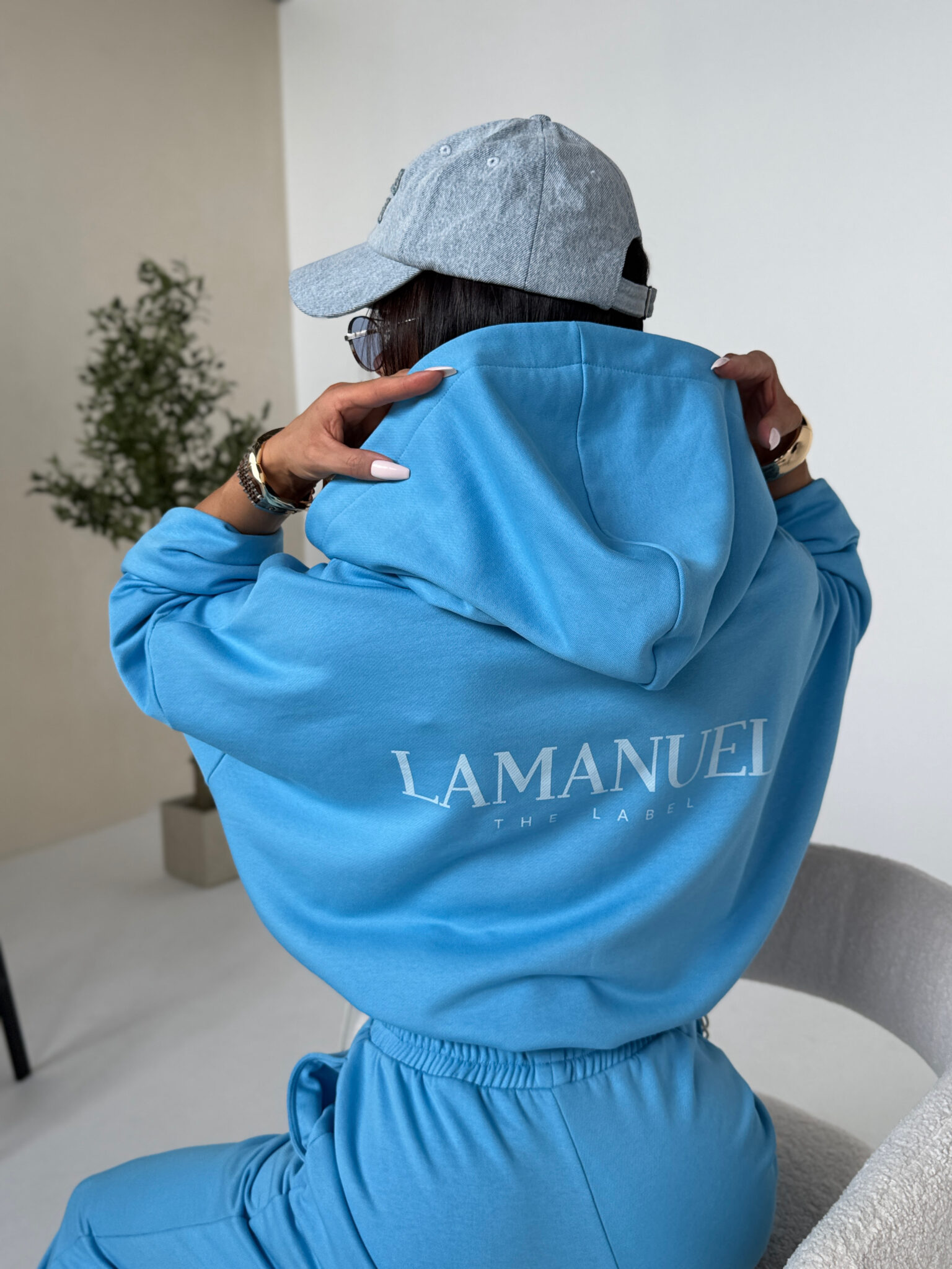 Bluza o luźnym kroju zapinana na suwak z kapturem i wszytym ściągaczem na dole, który umożliwia regulację szerokości i podkreślenie talii. Rękawy szerokie, zakończone delikatną gumką. Na piersi oraz na plecach znajduje się wyraziste logo LAMANUEL, które nadaje całości charakteru. Model wykonany z miękkiej, przyjemnej w dotyku dzianiny, idealny na co dzień i w podróży. Szerokie spodnie dresowe, stylizowane na męskie z wysokim stanem i elastyczną gumką w pasie oraz dodatkowym troczkiem do regulacji. Szeroka, prosta nogawka i wygodny krój zapewniają komfort noszenia i swobodę ruchów. Na biodrze widoczne logo LAMANUEL