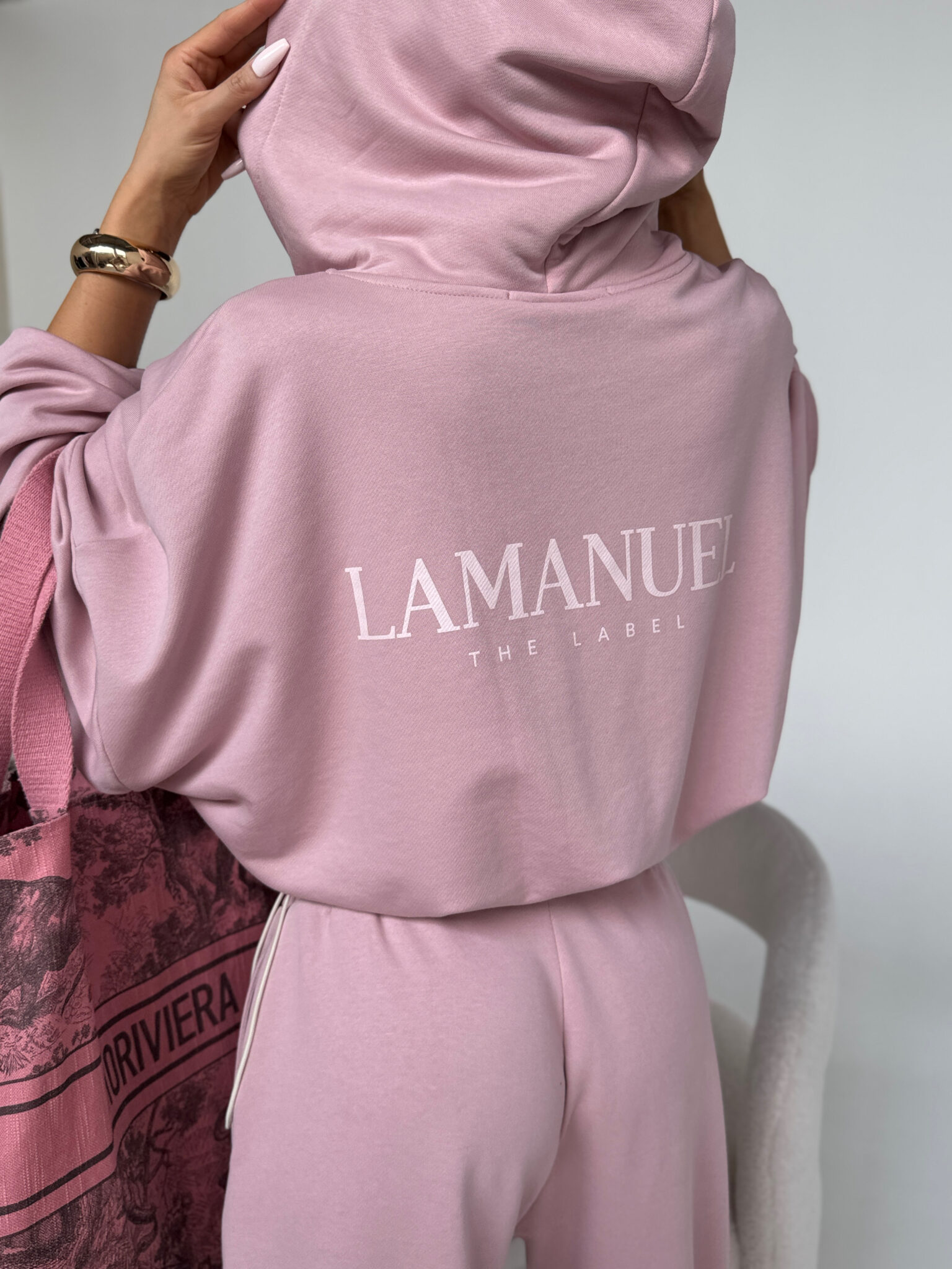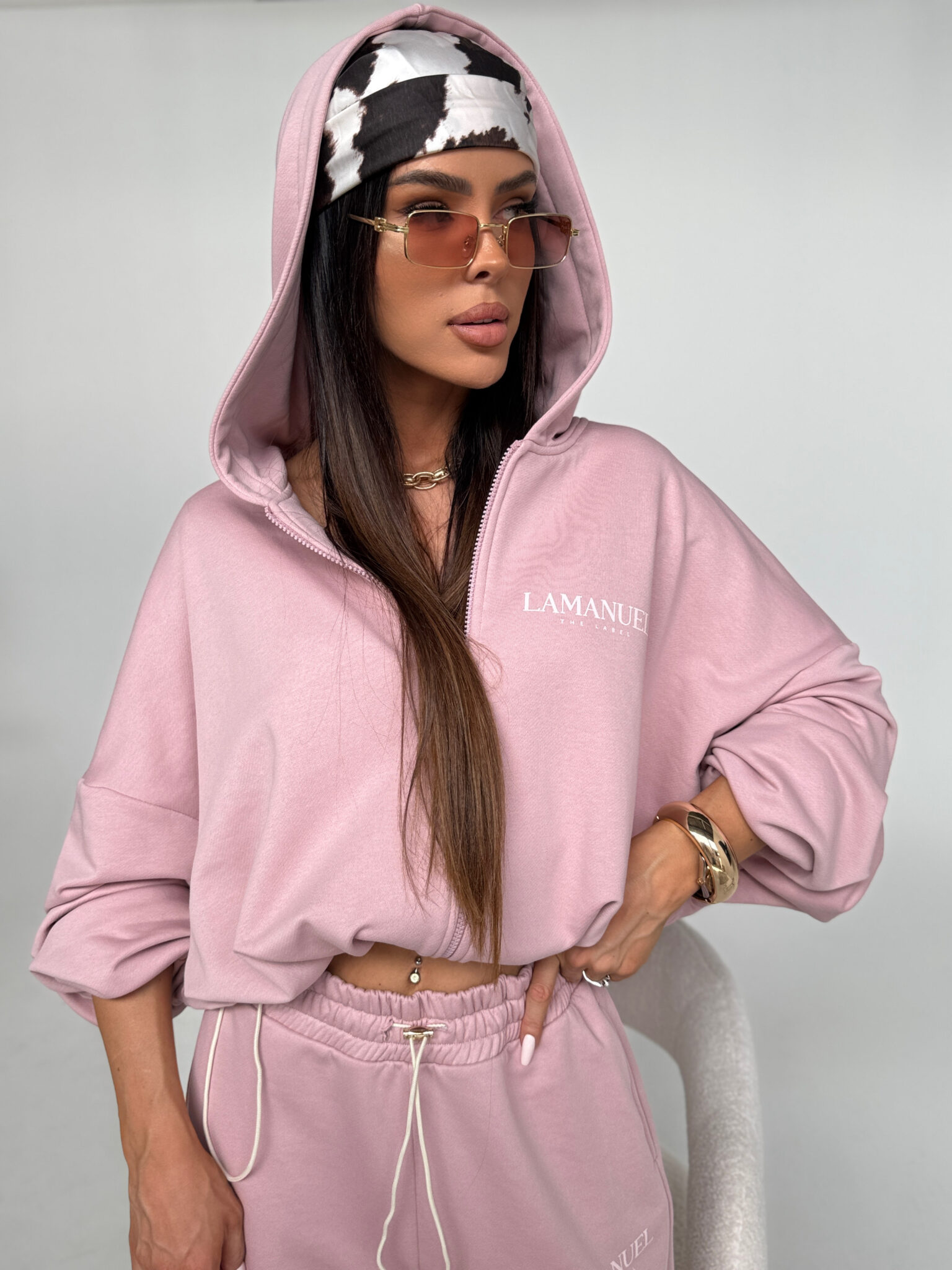 Bluza o luźnym kroju zapinana na suwak z kapturem i wszytym ściągaczem na dole, który umożliwia regulację szerokości i podkreślenie talii. Rękawy szerokie, zakończone delikatną gumką. Na piersi oraz na plecach znajduje się wyraziste logo LAMANUEL, które nadaje całości charakteru. Model wykonany z miękkiej, przyjemnej w dotyku dzianiny, idealny na co dzień i w podróży. Szerokie spodnie dresowe, stylizowane na męskie z wysokim stanem i elastyczną gumką w pasie oraz dodatkowym troczkiem do regulacji. Szeroka, prosta nogawka i wygodny krój zapewniają komfort noszenia i swobodę ruchów. Na biodrze widoczne logo LAMANUEL