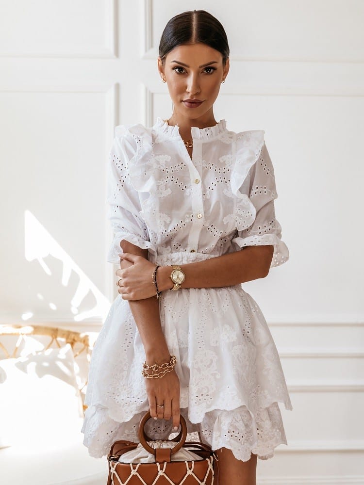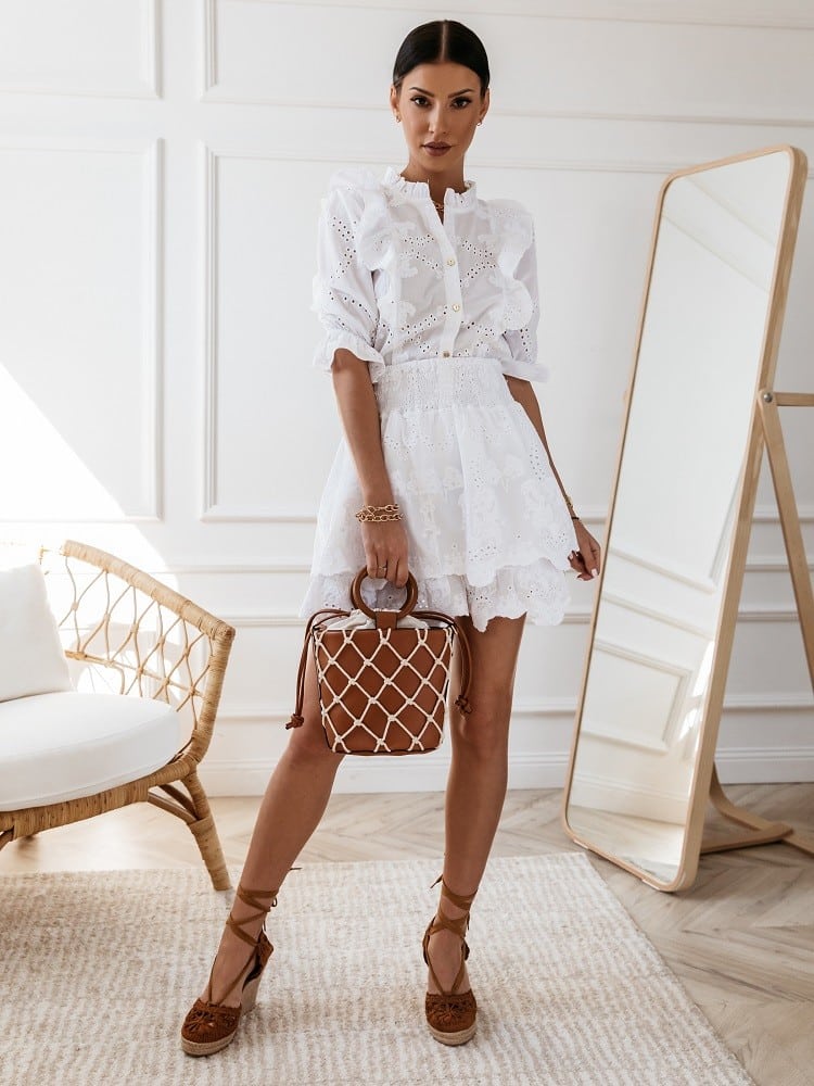 Efektowny, haftowany komplet Lou to świetna propozycja na okres wakacyjny. Szyku dodają liczne falbany i szeroki ściągacz u góry spódnicy. Made in Poland.