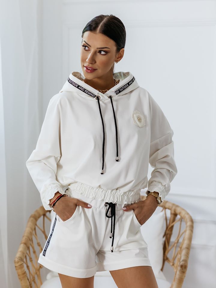 Komplet, to modna i wygodna propozycja na obecny sezon. Wykonany z najwyższej jakości materiału. Bluza z długim rękawem, ściągaczami na wykończeniach z kapturem. Spodenki w tali posiadają ściągacz z wiązaniem. Po bokach spodenek znajdują się praktyczne kieszenie. Made in Poland.