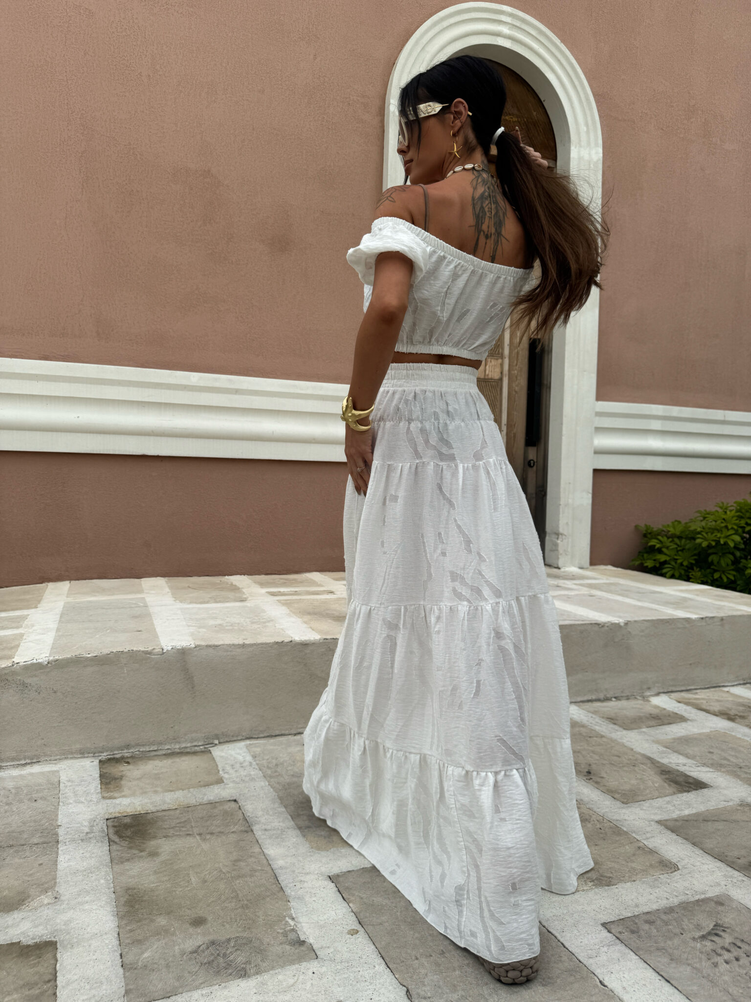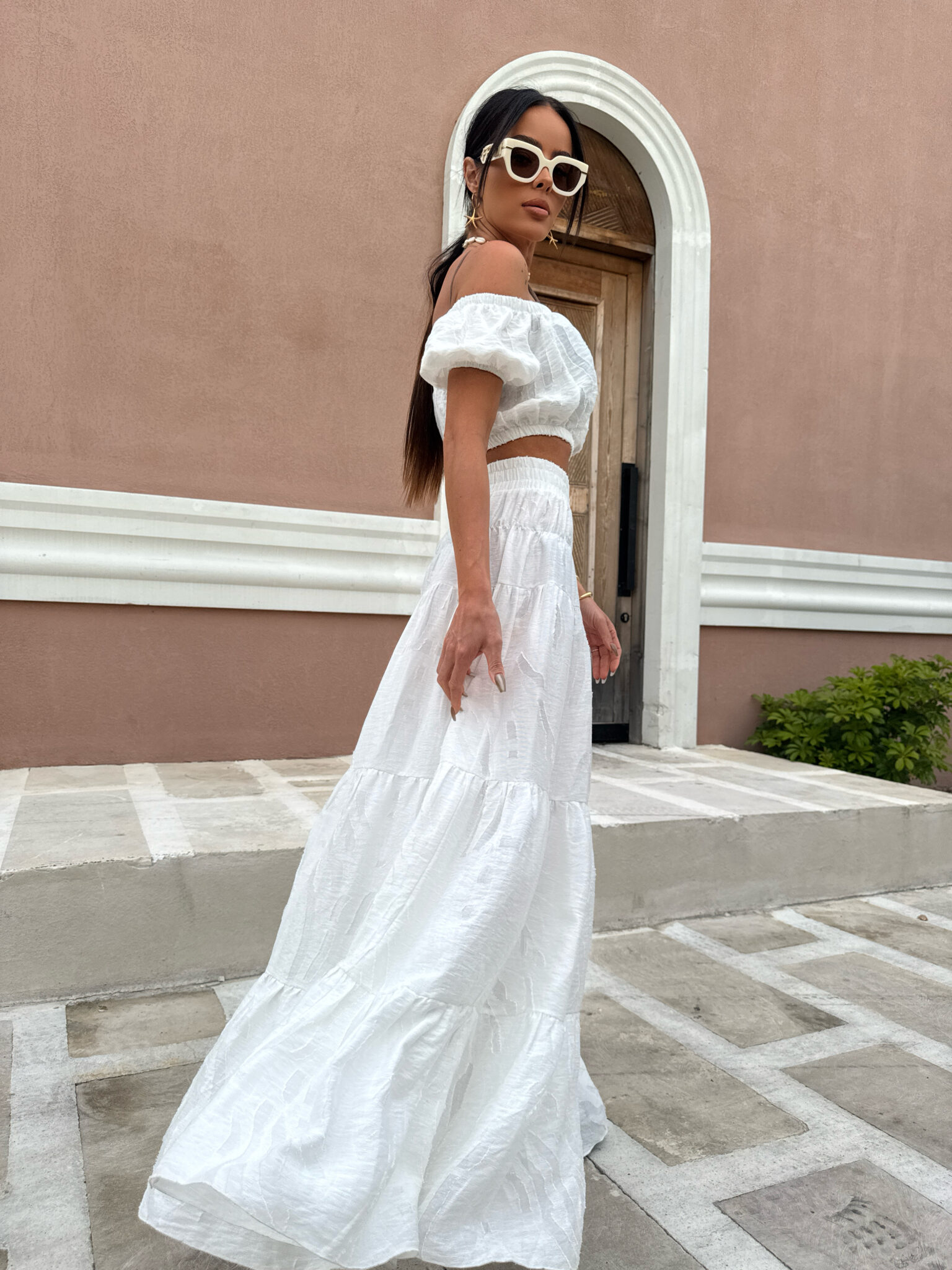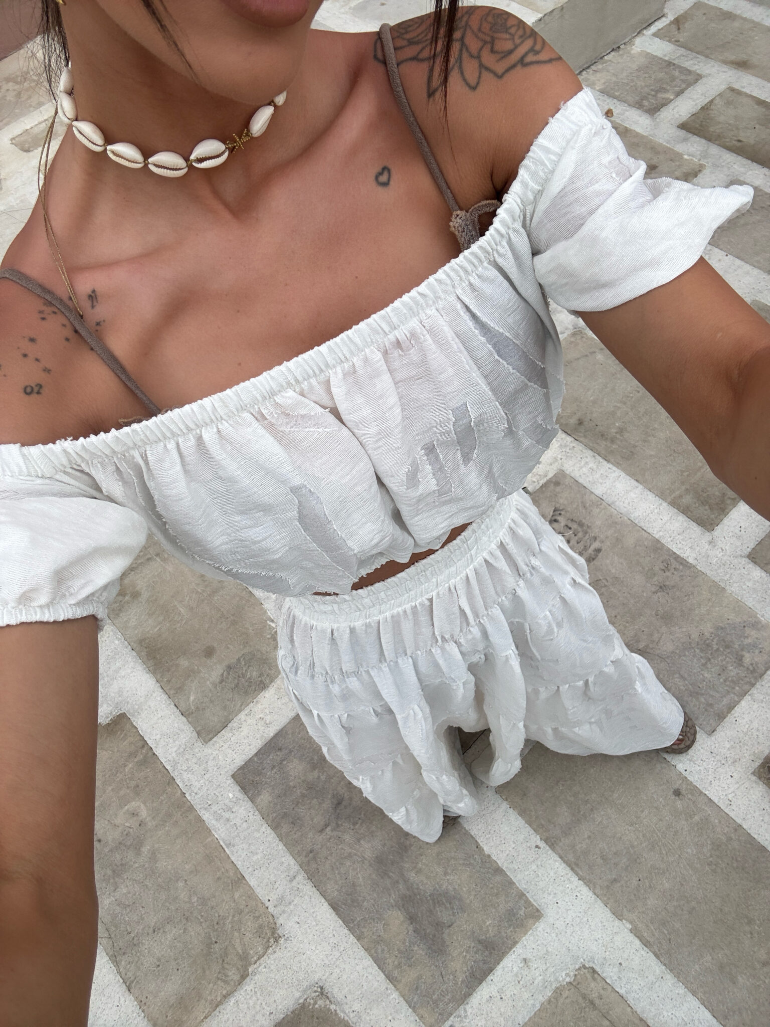 Komplet składa się z krótkiego topu z odkrytymi ramionami i marszczeniem oraz długiej, zwiewnej spódnicy w tym samym stylu, wykonany jest z lekkiego, półtransparentnego materiału z delikatnym połyskiem i subtelnym, wytłaczanym wzorem dodającym elegancji i letniego luzu, całość idealnie wpisuje się w klimat resortowy dzięki jasnej kolorystyce i kobiecej formie która pięknie układa się w ruchu i zapewnia komfort nawet w upalne dni.