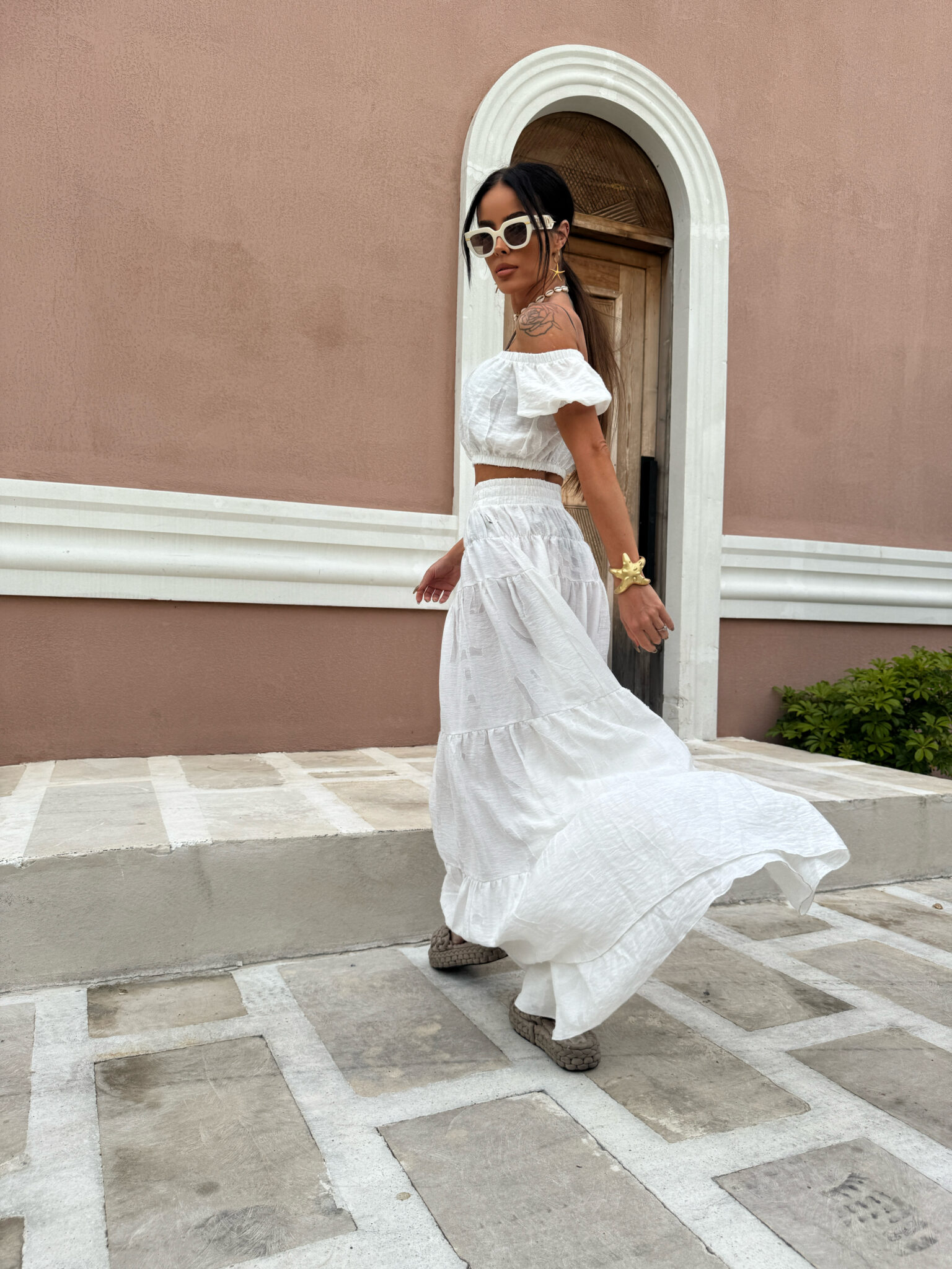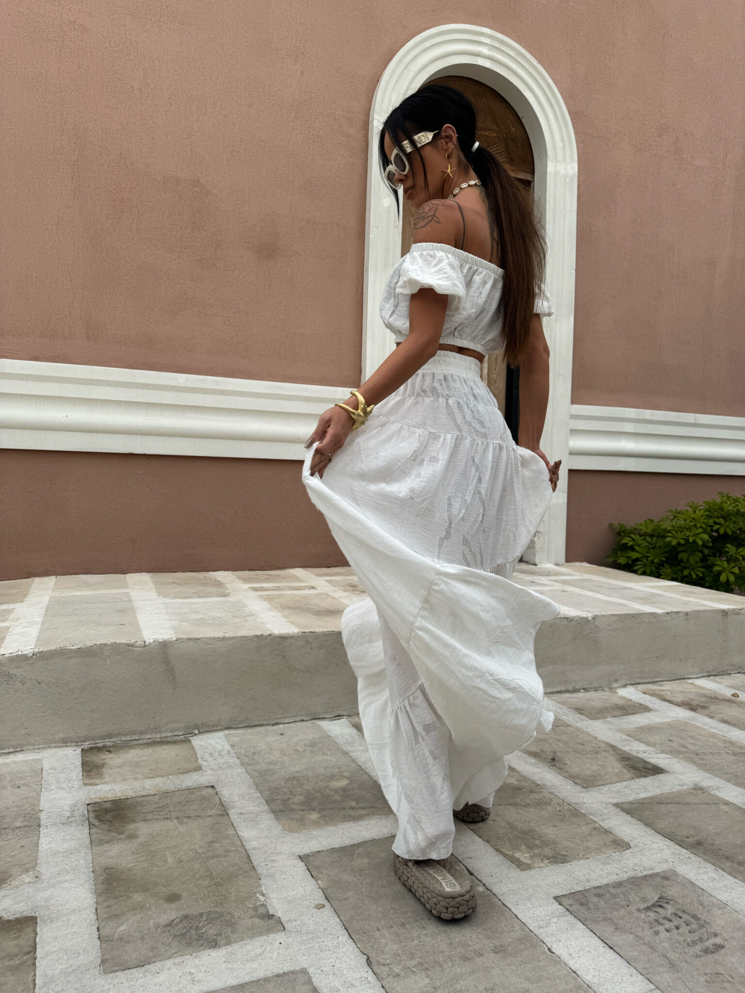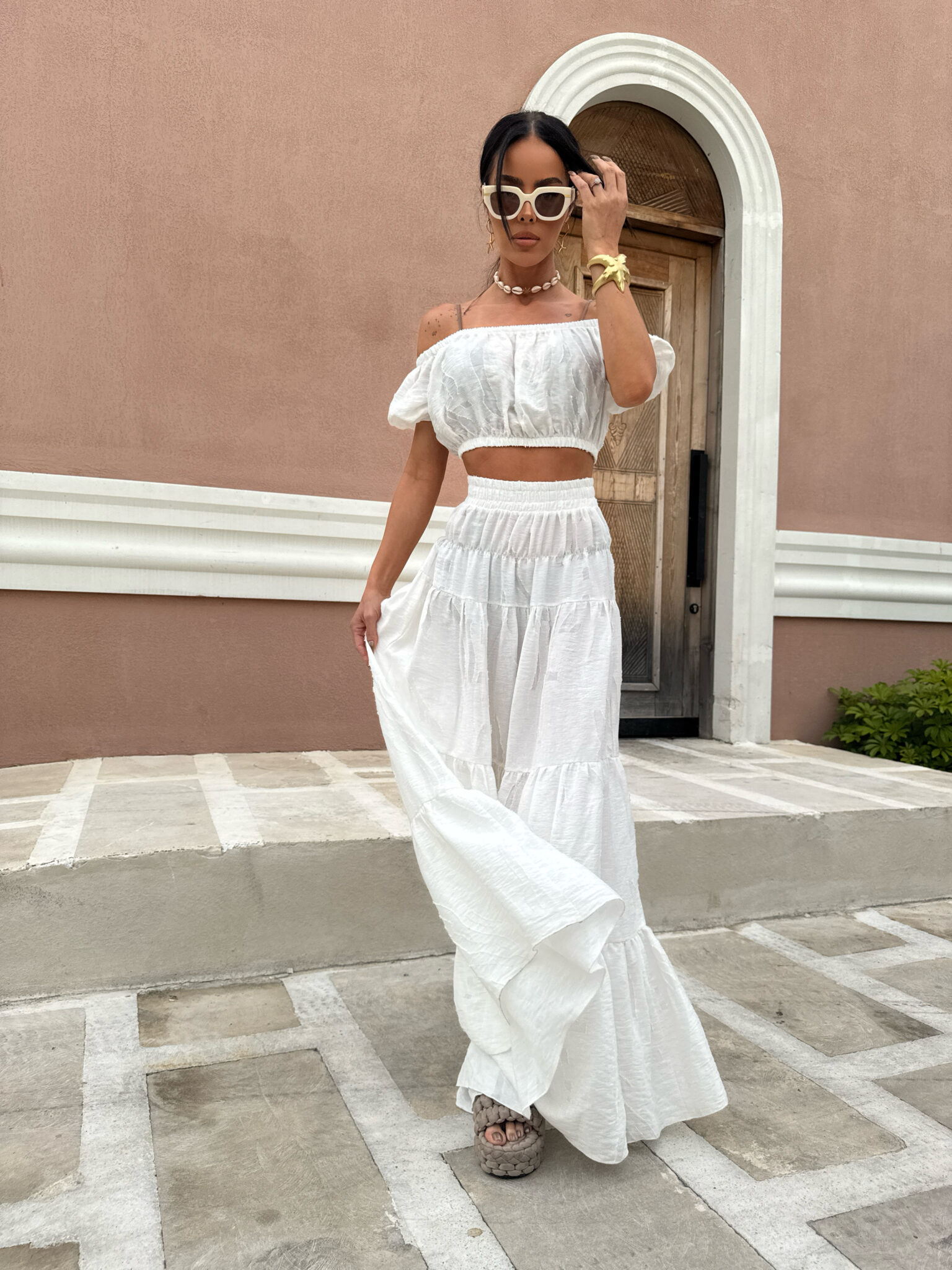 Komplet składa się z krótkiego topu z odkrytymi ramionami i marszczeniem oraz długiej, zwiewnej spódnicy w tym samym stylu, wykonany jest z lekkiego, półtransparentnego materiału z delikatnym połyskiem i subtelnym, wytłaczanym wzorem dodającym elegancji i letniego luzu, całość idealnie wpisuje się w klimat resortowy dzięki jasnej kolorystyce i kobiecej formie która pięknie układa się w ruchu i zapewnia komfort nawet w upalne dni.