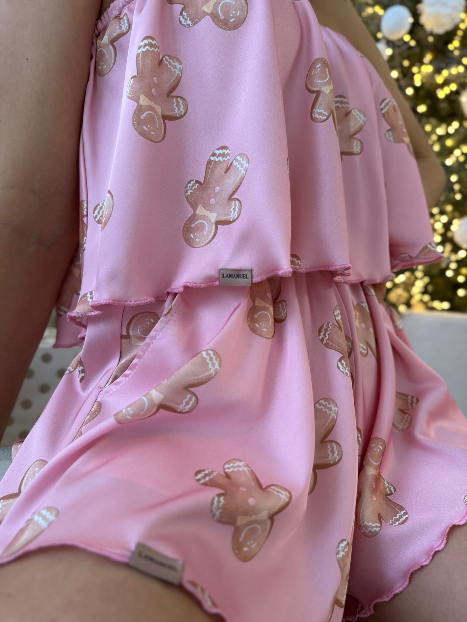 Ten set to kwintesencja świątecznego nastroju w wersji cute i na luzie. Lekki, dwuczęściowy komplet z falbaną i krótkimi spodenkami, który wygląda jak świąteczna bajka przeniesiona do garderoby. Delikatnie opływa ciało, daje pełen komfort i robi efekt bez wysiłku. Printy w świątecznym klimacie przyciągają spojrzenia, a subtelne metki LAMANUEL przy falbanie i nogawce to znak rozpoznawczy jakości i stylu. Idealny na prezent, świąteczne poranki i zdjęcia, które robią klimat.