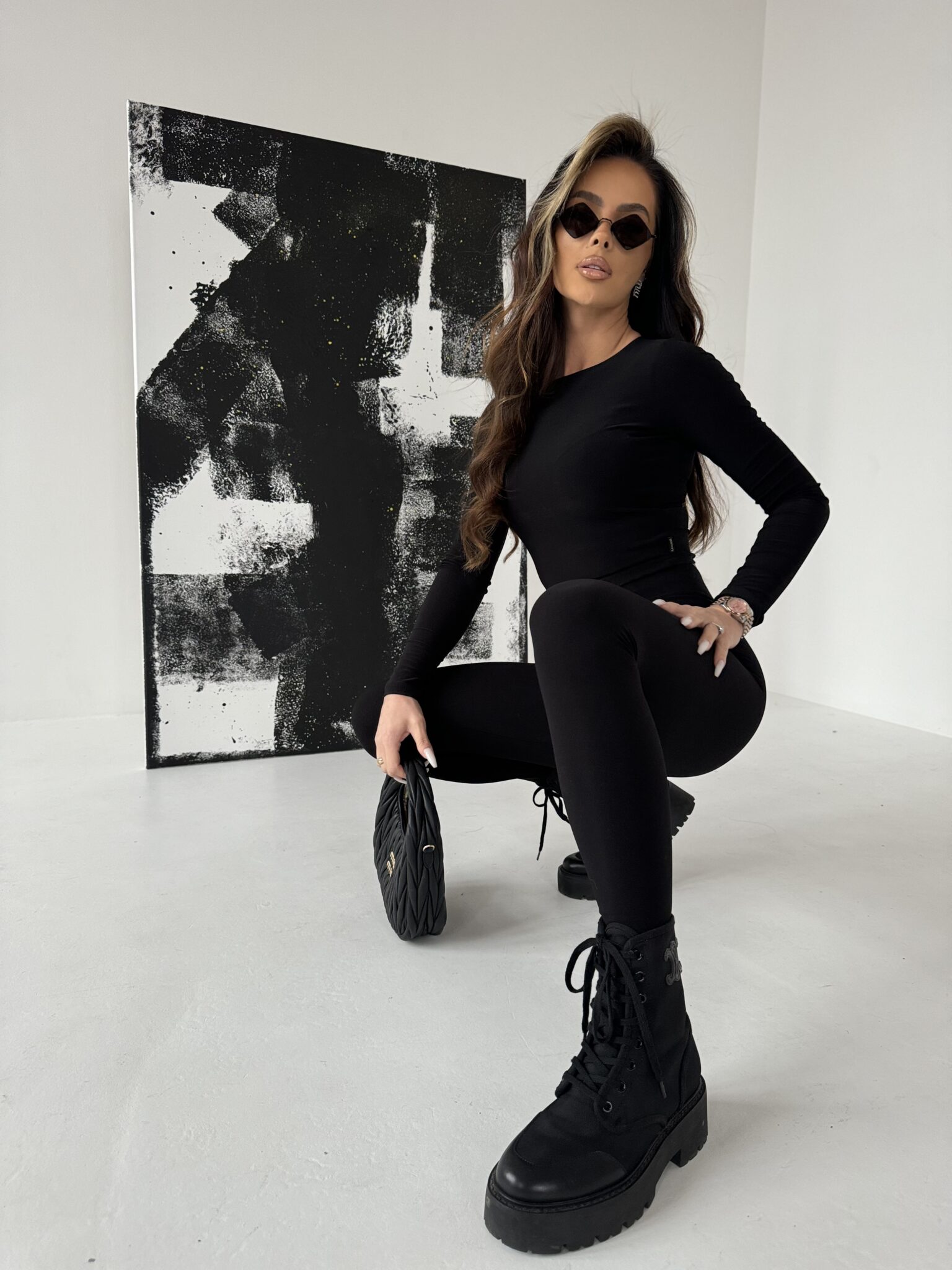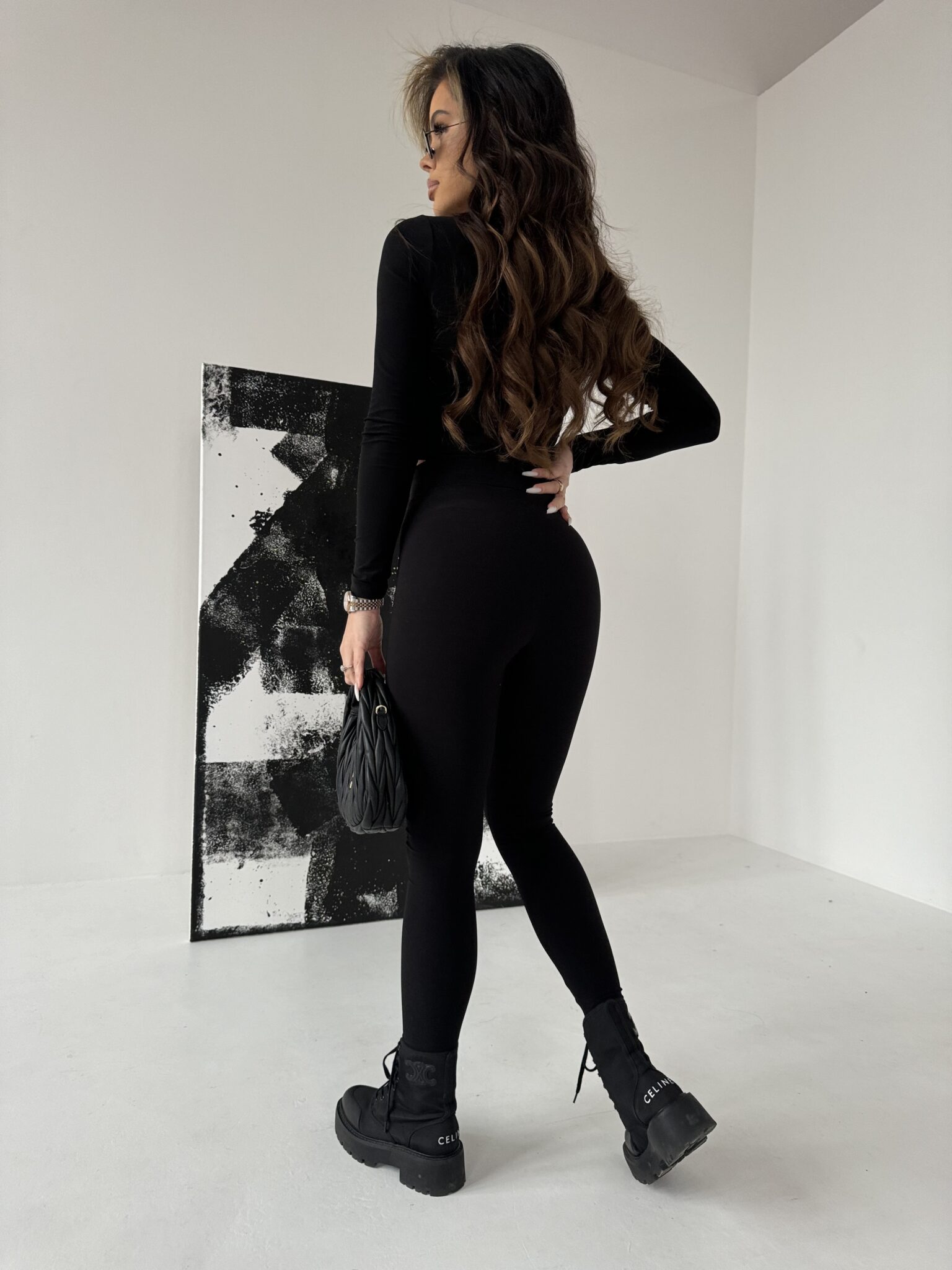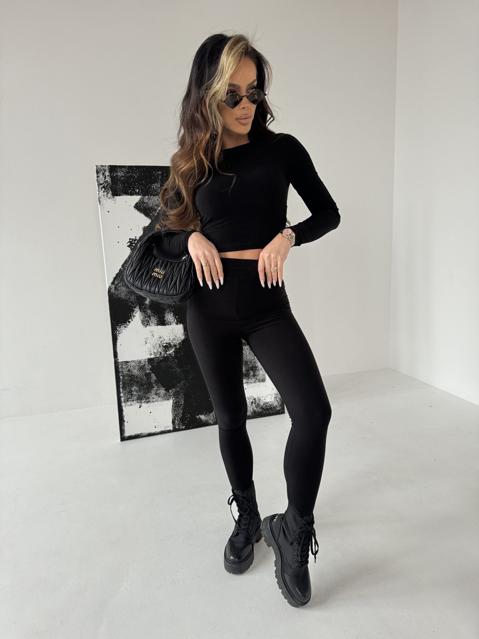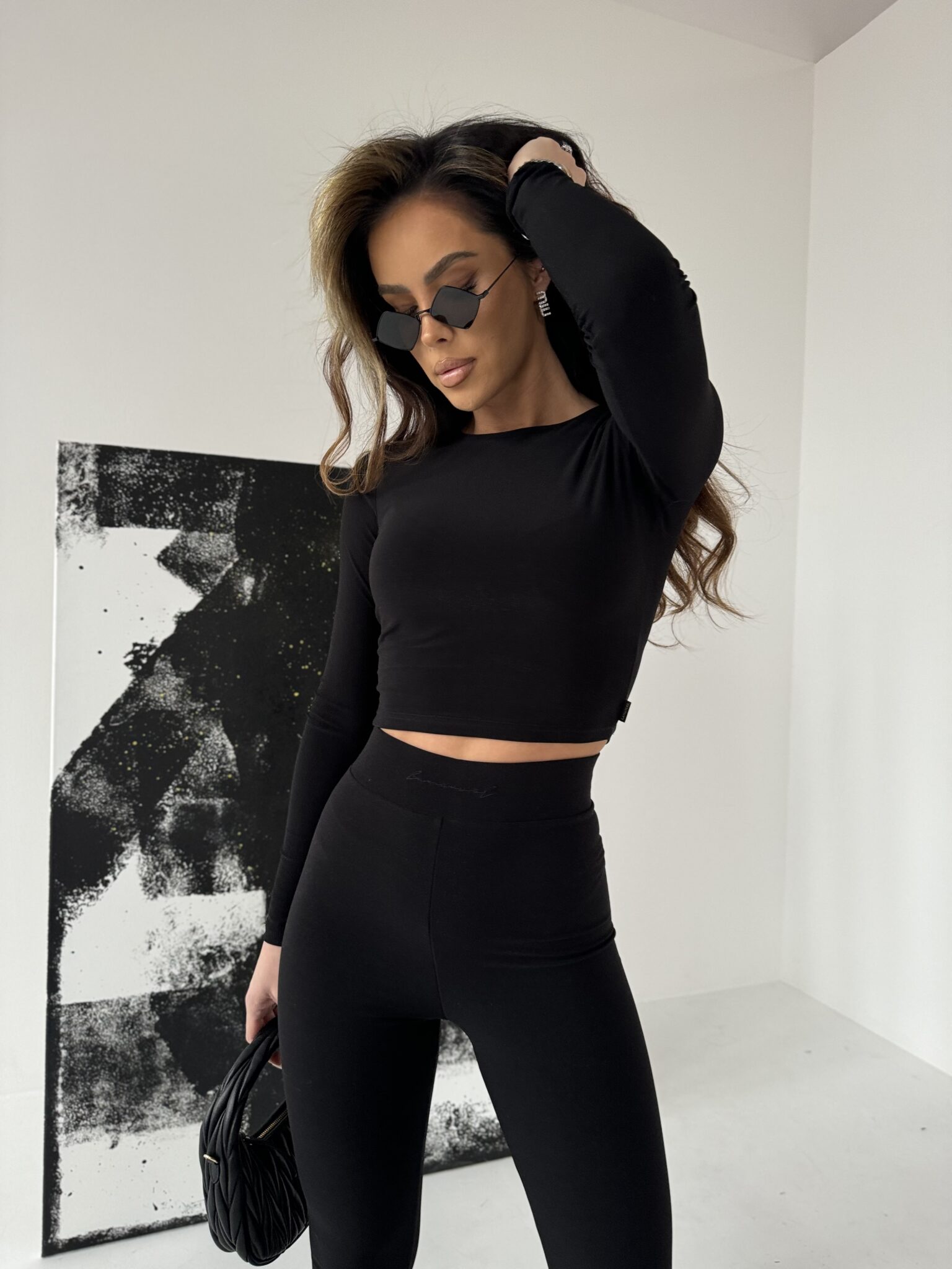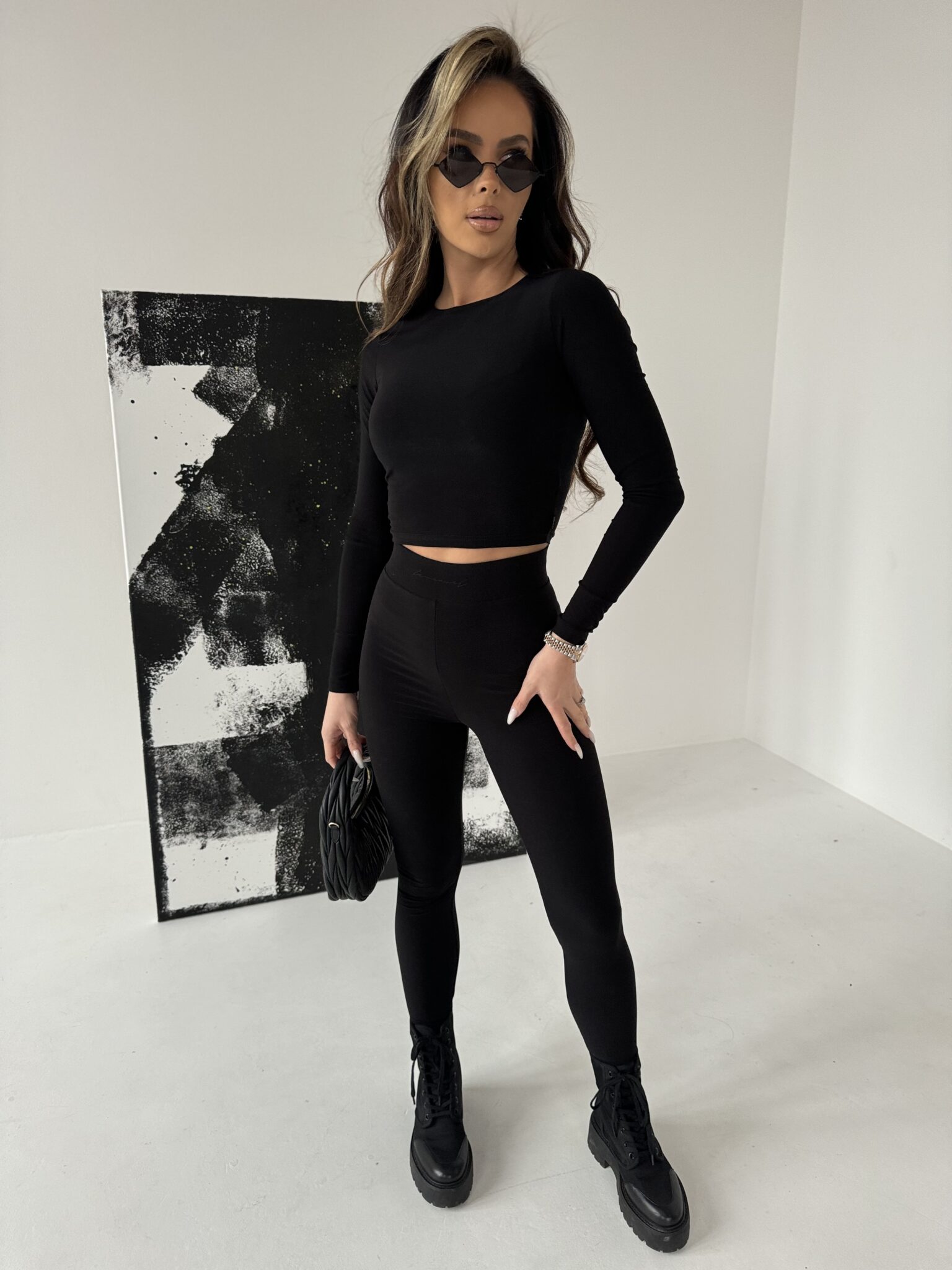 Komplet damski, zestaw składa się z dopasowanego topu o długim rękawie i nieco krótszym kroju, który podkreśla talię, zapewniając modny i zmysłowy wygląd. Top wykonany jest z elastycznego, oddychającego materiału, który idealnie dopasowuje się do sylwetki, podkreślając jej atuty. Do kompletu dołączone są legginsy z wysokim stanem, które pięknie modelują sylwetkę i zapewniają pełen komfort noszenia. Pas legginsów zdobi haftowane logo na elastycznej gumie, dodając całości sportowego charakteru i oryginalności. Made in Poland .