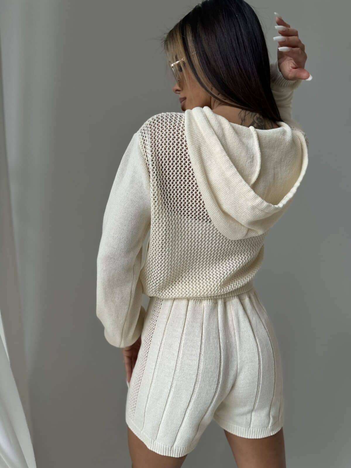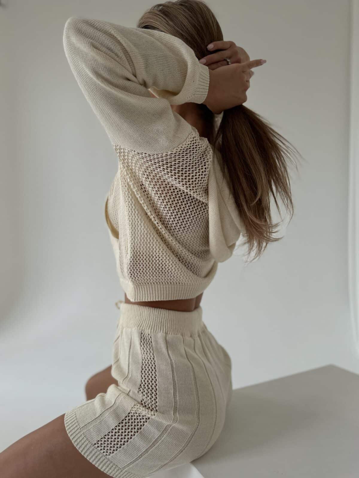 Ten zestaw damski to połączenie komfortu i stylu, idealny na wiele okazji. Ażurowa bluza zachwyca swoim lekkim i przewiewnym charakterem, doskonałym na cieplejsze dni. Wyposażona w kaptur z regulacją na sznurek oraz kieszeń na przodzie, która dodaje praktyczności, umożliwiając noszenie drobnych przedmiotów. Spodenki z wysokim stanem to klasyka wśród wygody i elegancji. Wykonane z miękkiej przędzy, doskonale dopasowują się do sylwetki, podkreślając jej atuty. Sznurki w pasie nie tylko dodają uroku, ale także pozwalają na regulację, dzięki czemu spodenki idealnie dopasowują się do Twoich preferencji. Made in Poland .