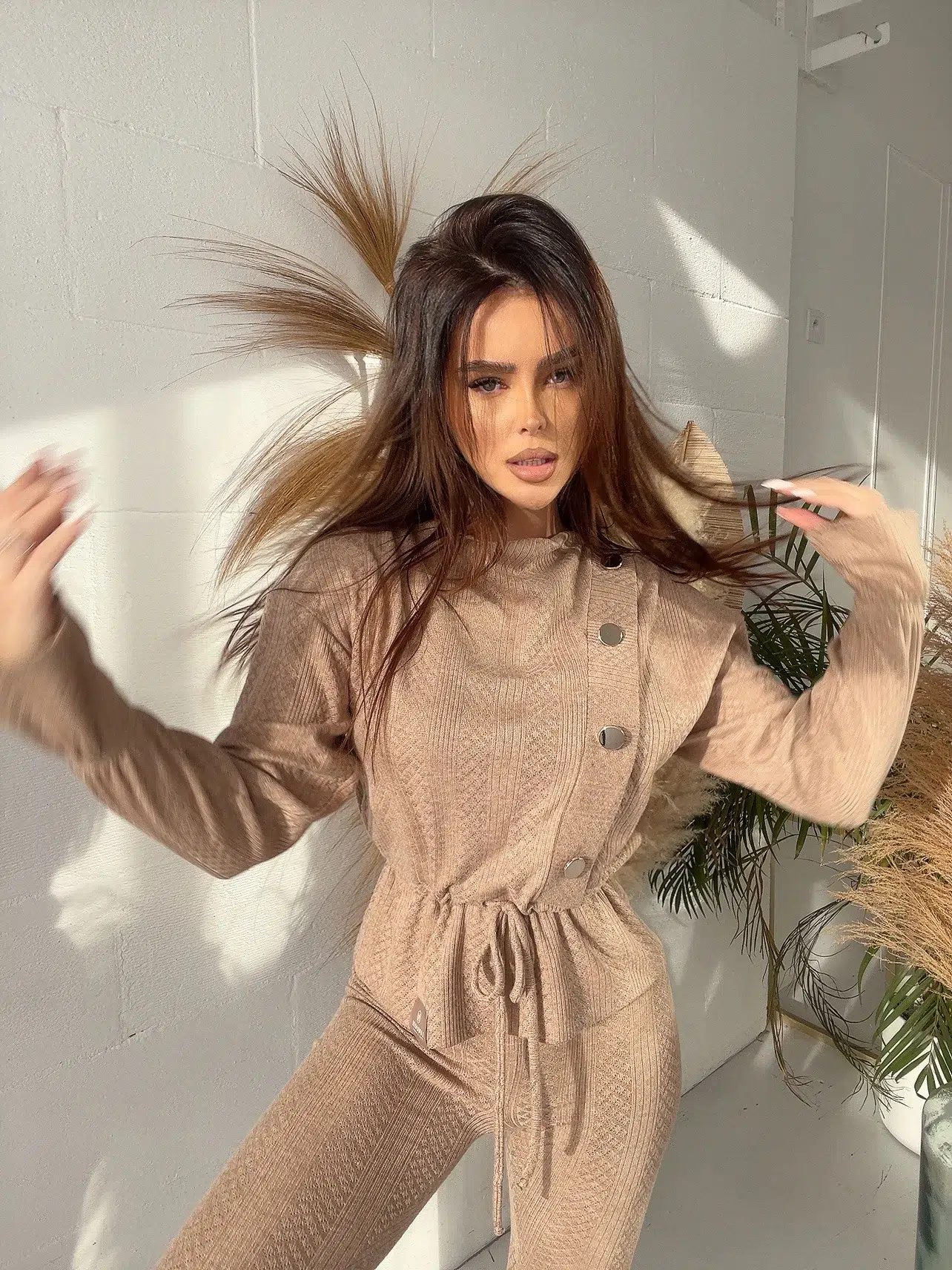 Komplet damski sweterkowy składa się z bluzki oraz legginsów. Bluzka damska posiada półgolf opadający lekko na front oraz sznurek w pasie, dzięki któremu można dopasować ją idealnie do swojej sylwetki. Legginsy damskie o podwyższonym stanie wykonane ze sweterkowego materiału posiadają podwyższony stan oraz szeroką gumkę w pasie. Ten zestaw można również nosić osobno. Made in Poland .