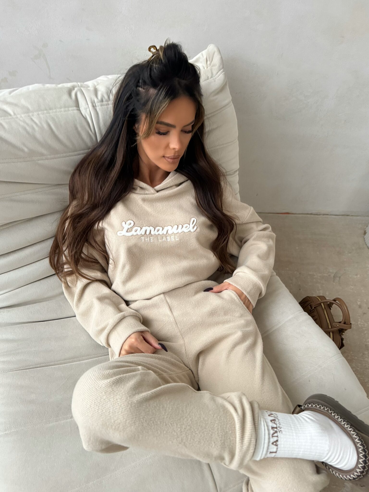 Stylowy i niezwykle wygodny damski komplet dresowy to idealny wybór na chłodniejsze dni. Wykonany z miękkiego, puszystego materiału typu “miś”, zapewnia ciepło i komfort na najwyższym poziomie. Bluza z kapturem posiada gumę w talii, która podkreśla sylwetkę, nadając jej kobiecy kształt, a jednocześnie zapewnia wygodę. Na przodzie bluzy znajduje się subtelne logo, które dodaje całości modnego wyrazu. Do kompletu dołączone są spodnie z elastyczną talią i praktycznymi kieszeniami, które sprawdzą się zarówno na spacerze, jak i w domowym zaciszu.
