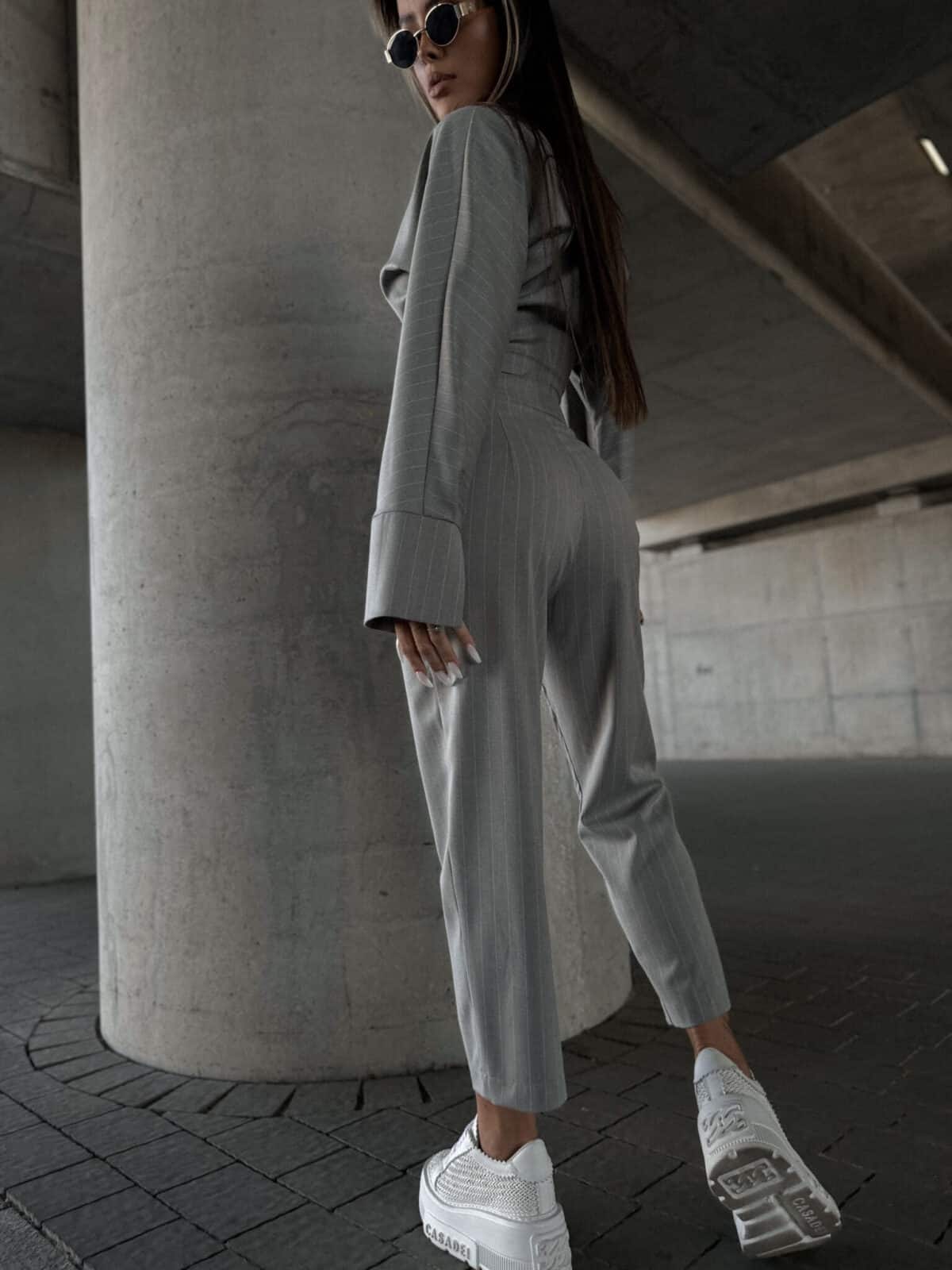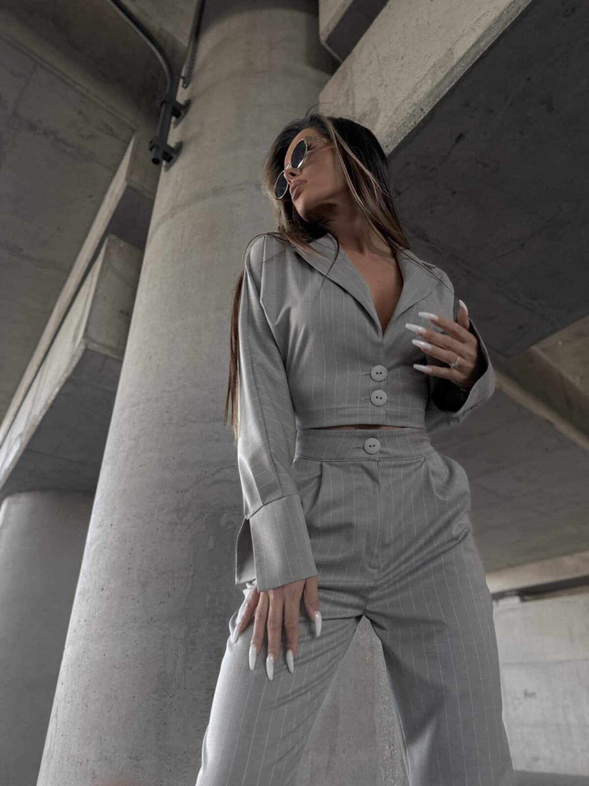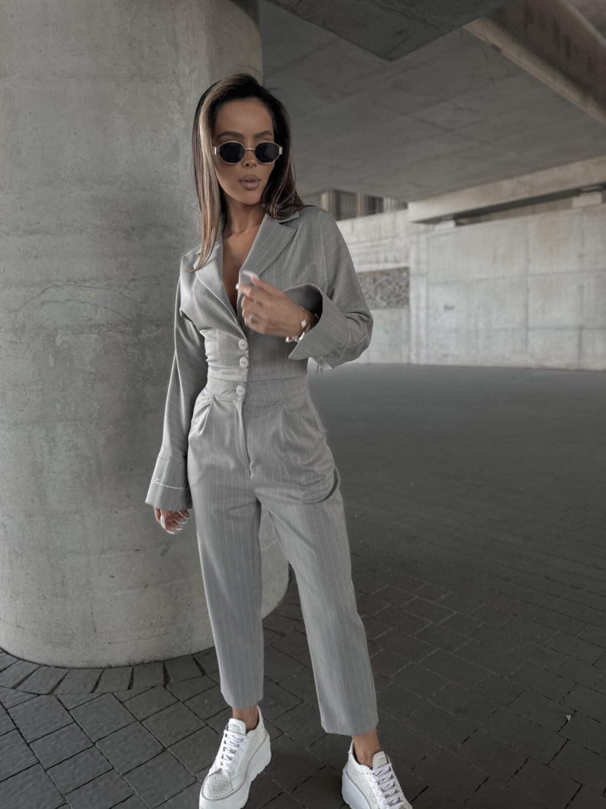 Damski komplet w paski składający się z marynarki o ciekawym kroju kimona oraz spodni cygaretek. Marynarka jest szersza pod pachami, a dopasowana w talii, dzięki czemu uzyskujemy podkreślenie sylwetki klepsydry. Wybierz go na wieczorne wyjścia bądź na co dzień, idealnie pasuje zarówno do szpilek jak i trampek. Made in Poland .