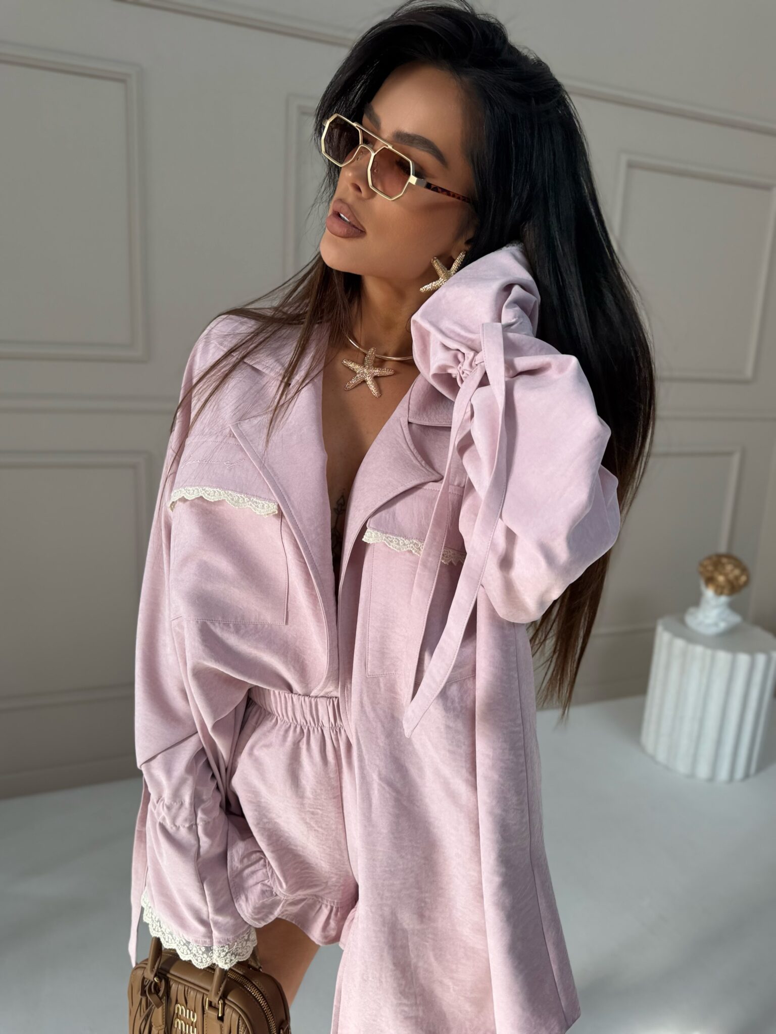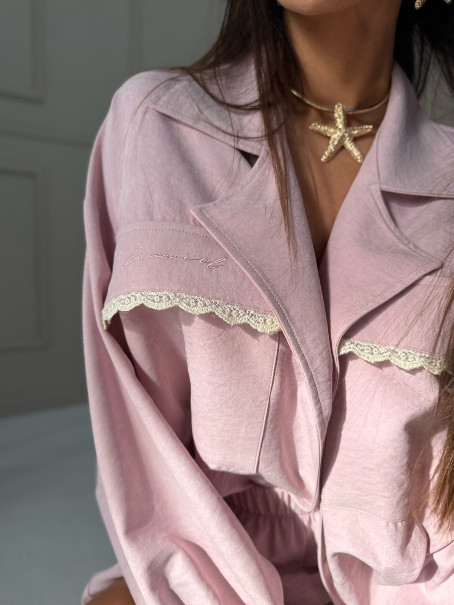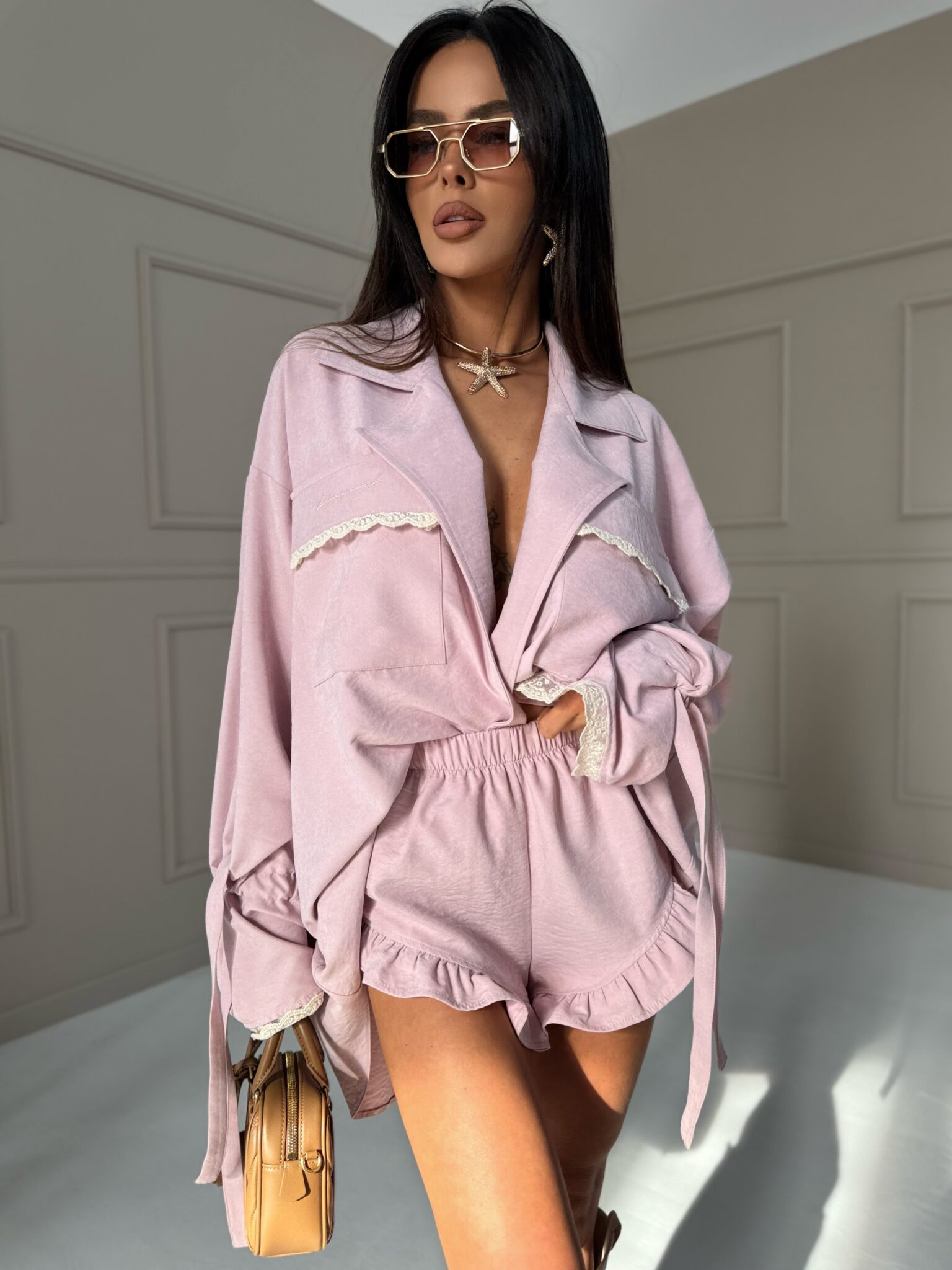 Komplet damski będący idealnym połączeniem lekkości i subtelnej elegancji! Koszula maxi z delikatnymi koronkowymi wykończeniami prezentuje się niezwykle kobieco – możesz nosić ją luźno, przewiązaną paskiem w talii lub rozpiętą na top i jeansy. W duecie ze spodenkami z falbankami tworzy spójną stylizację, która sprawdzi się zarówno na letnie wyjścia, jak i bardziej casualowe okazje. Dzięki uniwersalnemu krojowi możesz bawić się warstwami i dopasować zestaw do swojego stylu.