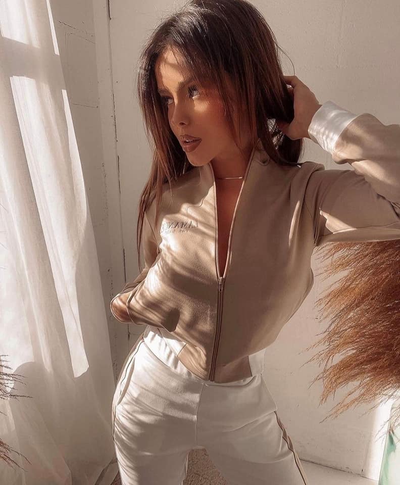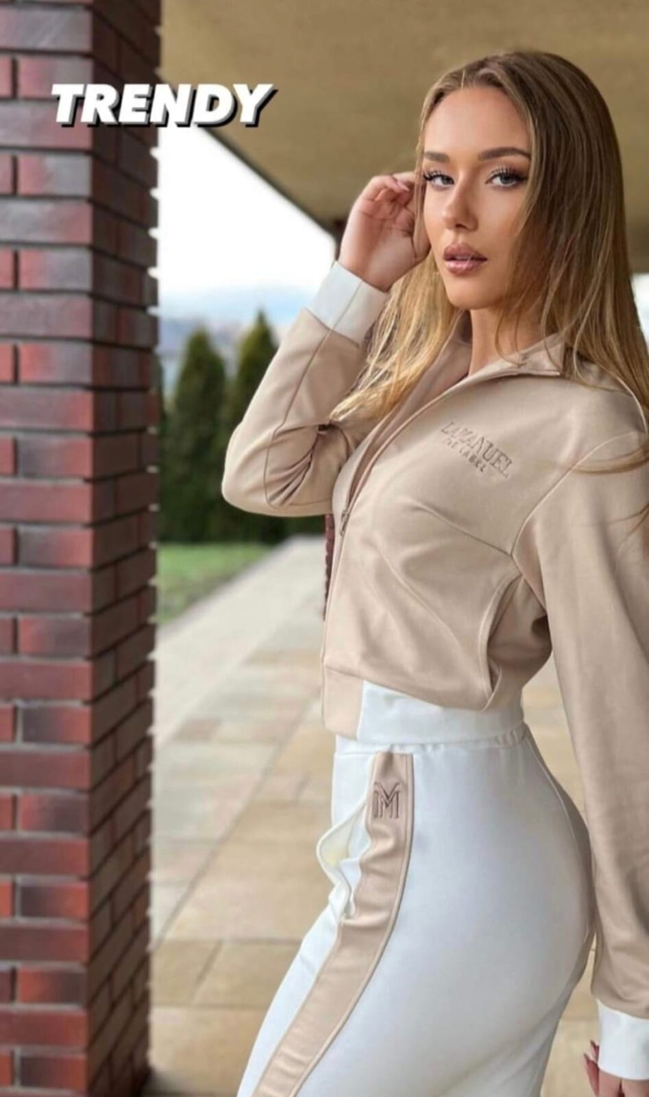 Świetny komplet damski. Bluza damska dwukolorowa. Bluza stworzona została z połączenia dwóch materiałów, dzięki czemu wygląda niezwykle oryginalnie. Zapinana na suwak , posiada kieszenie oraz ściągacz w talii. Spodnie z podwyższonym pasem posiadają szeroki pas. Stworzone zostały w jednym z najmodniejszych kolorów tego sezonu. Spodnie posiadają dwie kieszenie. Z boku lampasy w kolorze beżowym. Będzie idealny jako baza do wielu stylizacji. Made in Poland.