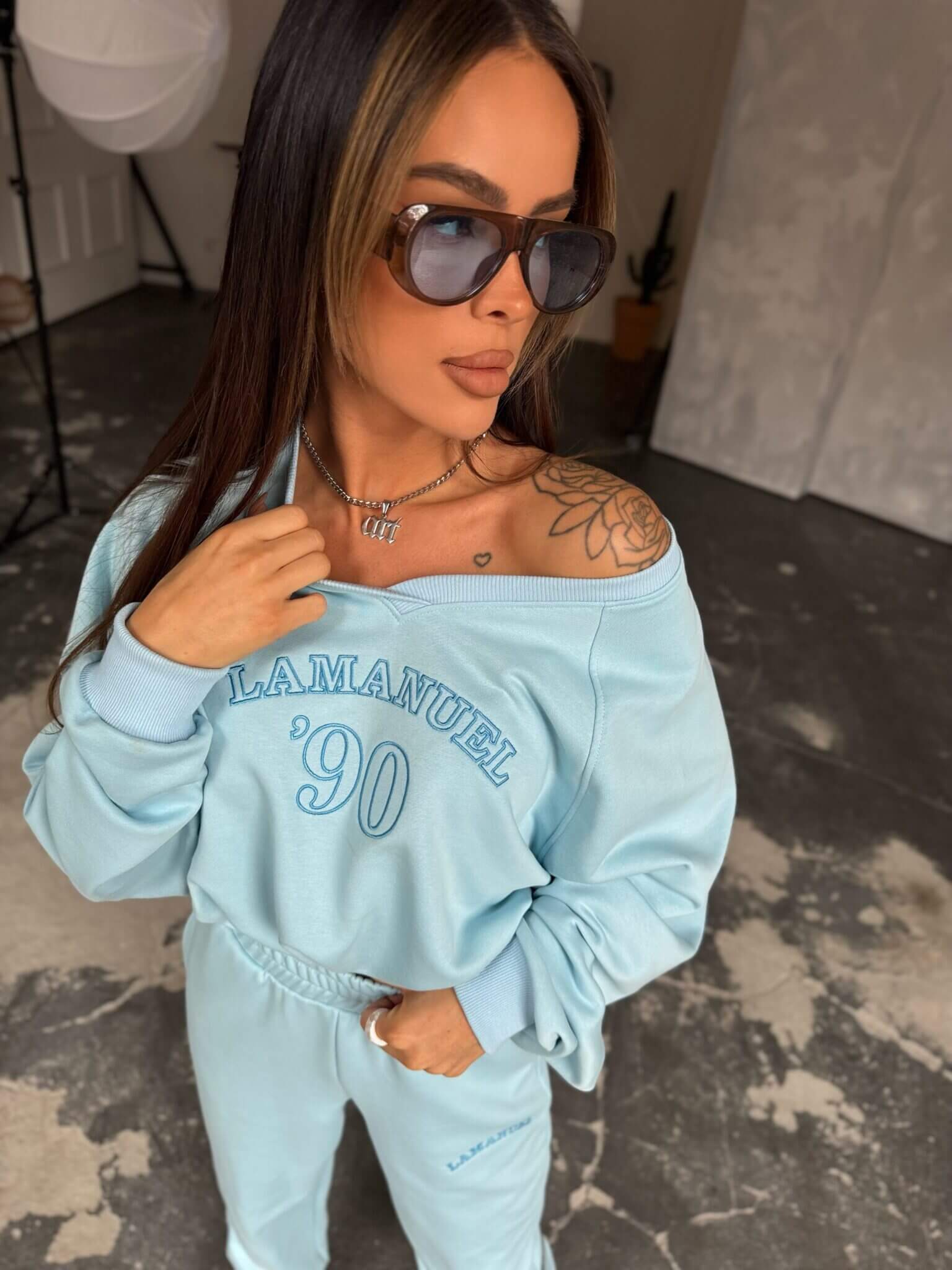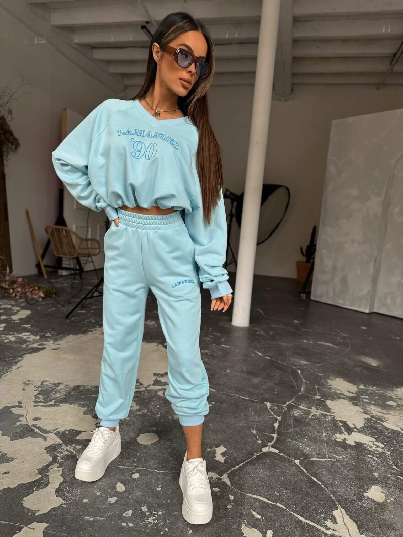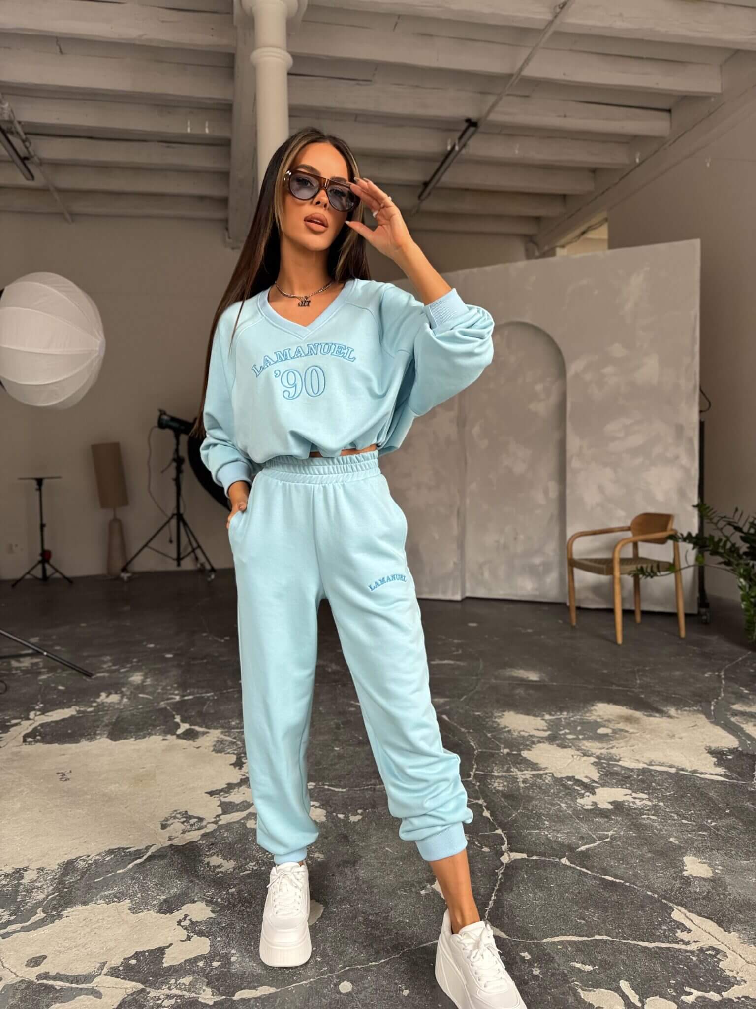 Komplet dresowy damski. Bluza z dekoltem w serek bez kaptura nadaje lekkości i subtelnie podkreśla szyję, a jej luźniejszy krój zapewnia swobodę ruchów. Klasyczne dresowe spodnie z kieszeniami doskonale dopasowują się do sylwetki, nie tracąc przy tym na wygodzie. To zestaw, który sprawdzi się zarówno na co dzień, jak i w bardziej dopracowanych stylizacjach