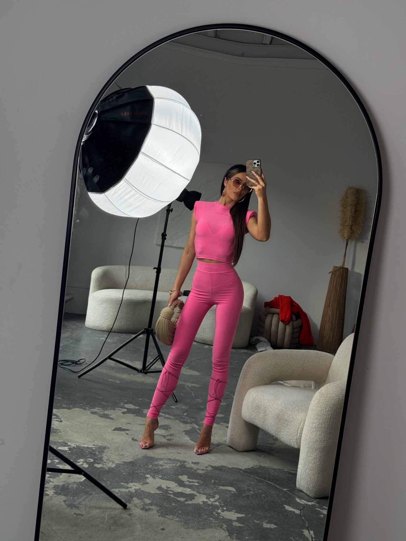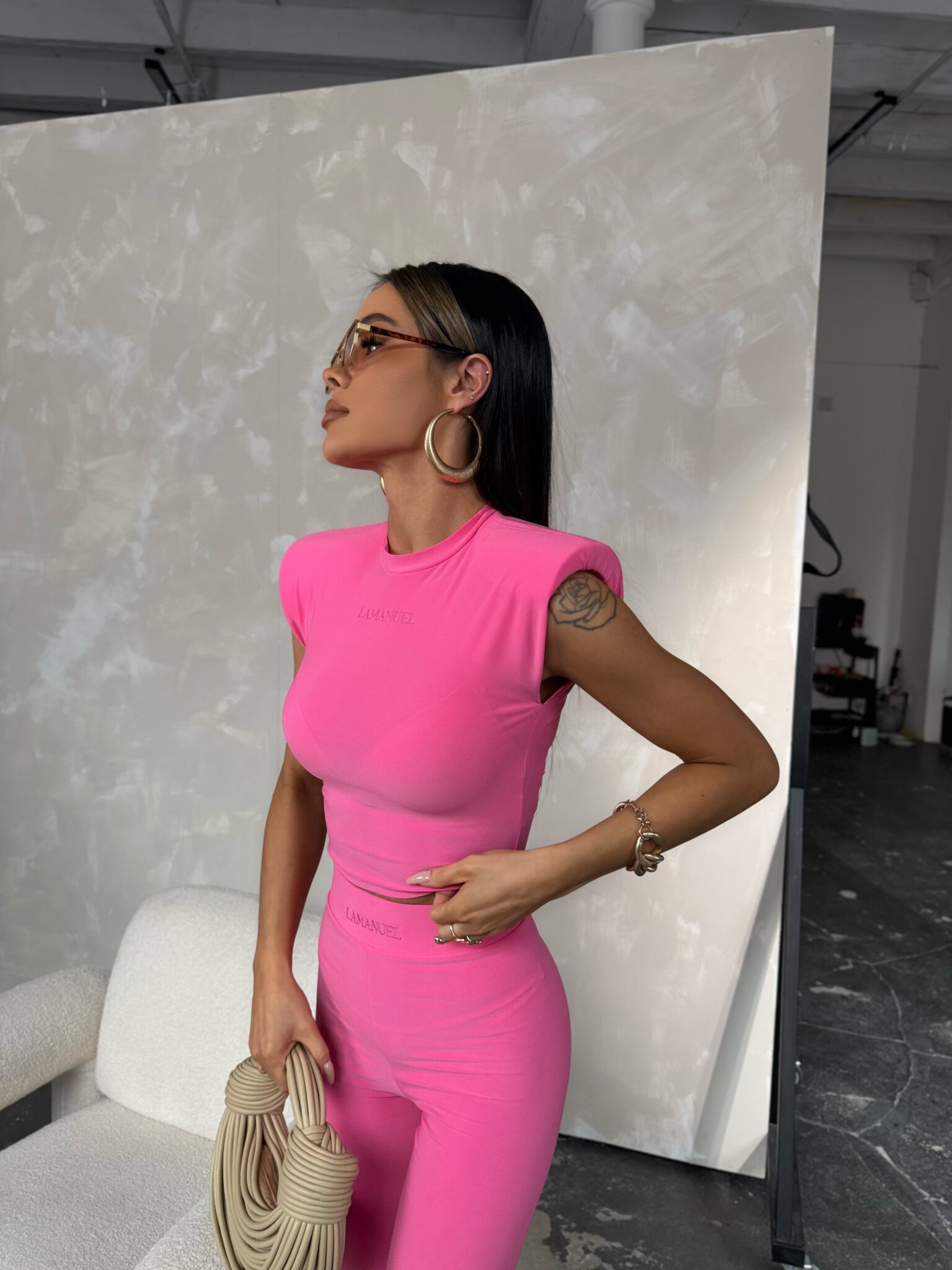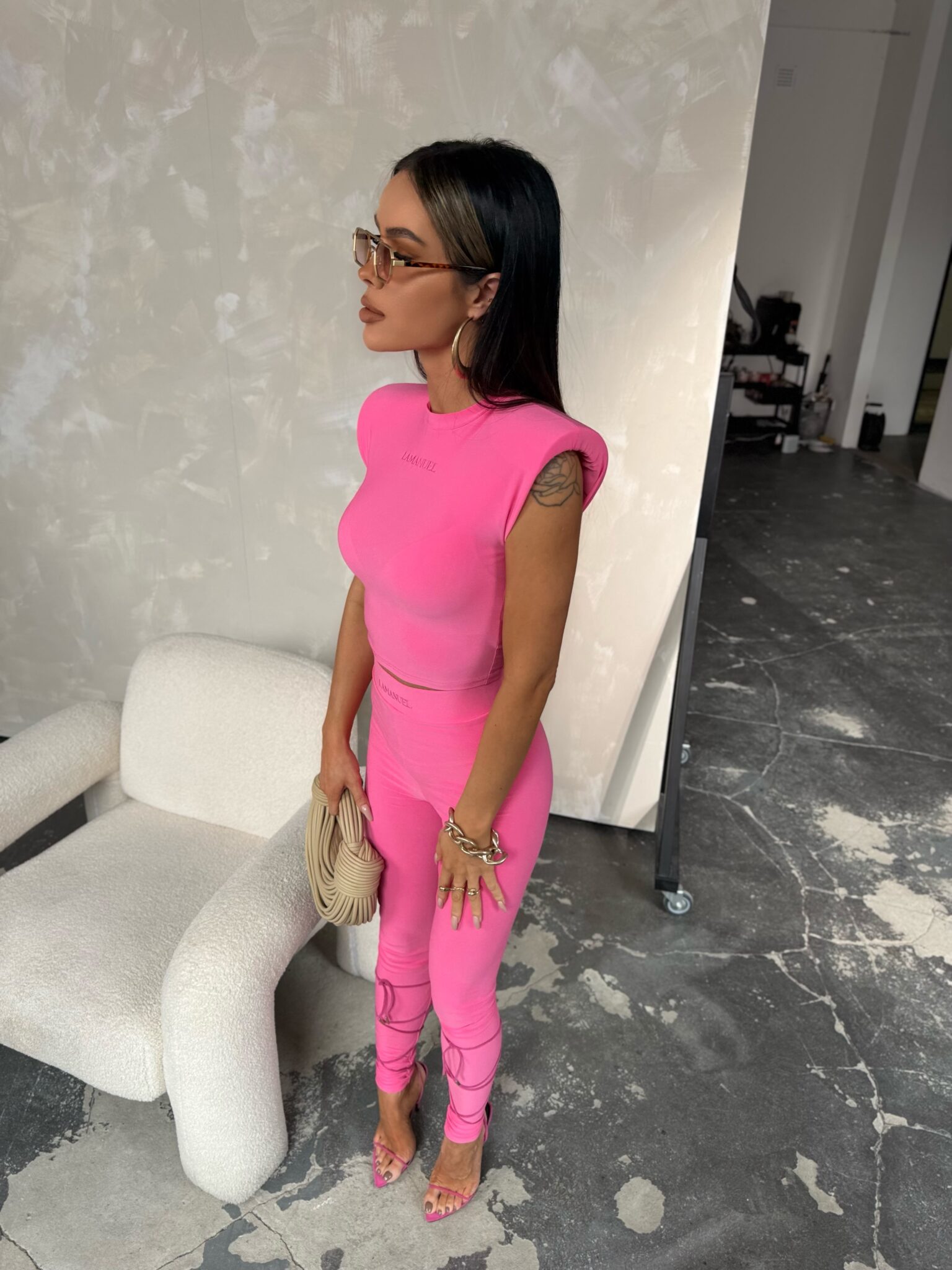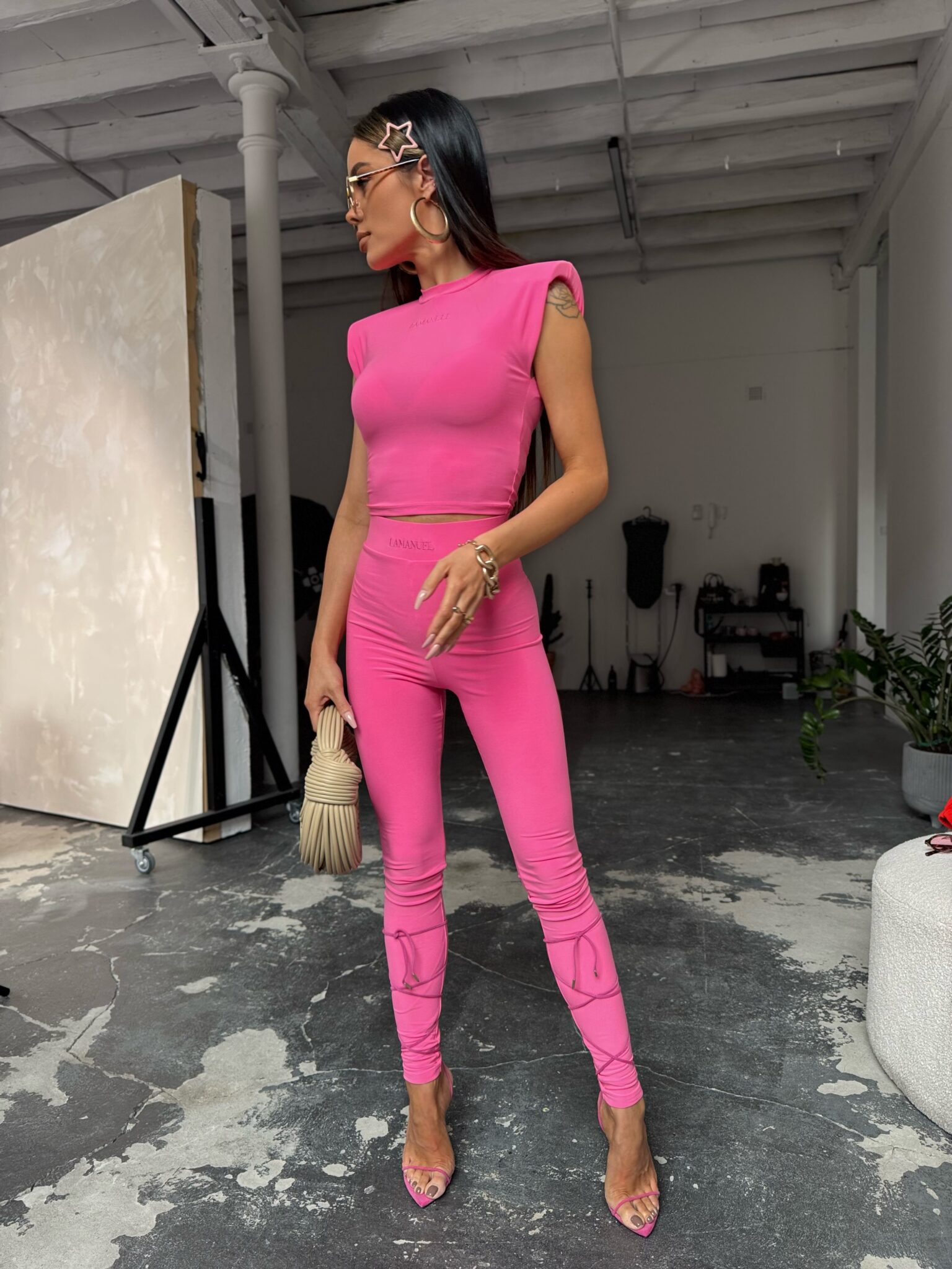Nowoczesny komplet, który łączy minimalistyczny design z odważnym charakterem. Dopasowany top z poduszkami na ramionach i legginsy z wysokim stanem tworzą idealne zestawienie, które modeluje sylwetkę i zapewnia efektowny wygląd.