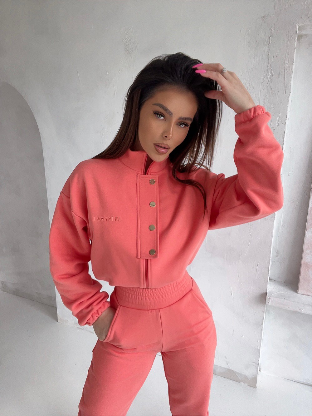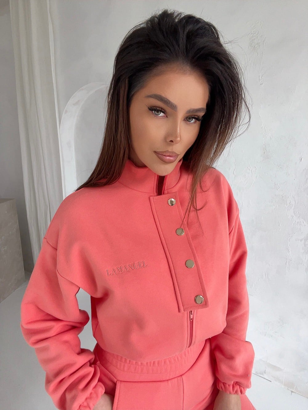 Nasz nowy komplet dresowy damski składa się z wygodnej i modnej bluzy oraz spodni, które zapewniają doskonały komfort i stylowy wygląd. Bluza z patką i złotymi napami dodaje elegancji całemu zestawowi, a jednocześnie zapewnia niezwykłą wygodę. Bluza posiada zapięcie na suwak. Cały komplet posiada aż trzy wyhaftowane loga marki. Spodnie z wysokim stanem posiadają szeroką gumę i kieszenie. Ich dopasowany krój podkreśla kobiece kształty, a jednocześnie zapewnia swobodę ruchów. Kieszenie w spodniach są praktycznym dodatkiem i dodają im charakteru. Komplet został wykonany z wysokiej jakości materiałów, co gwarantuje trwałość i wygodę użytkowania przez długi czas. Doskonale sprawdzi się jako strój na co dzień, do szkoły, pracy, czy podczas rekreacji. Made in Poland .