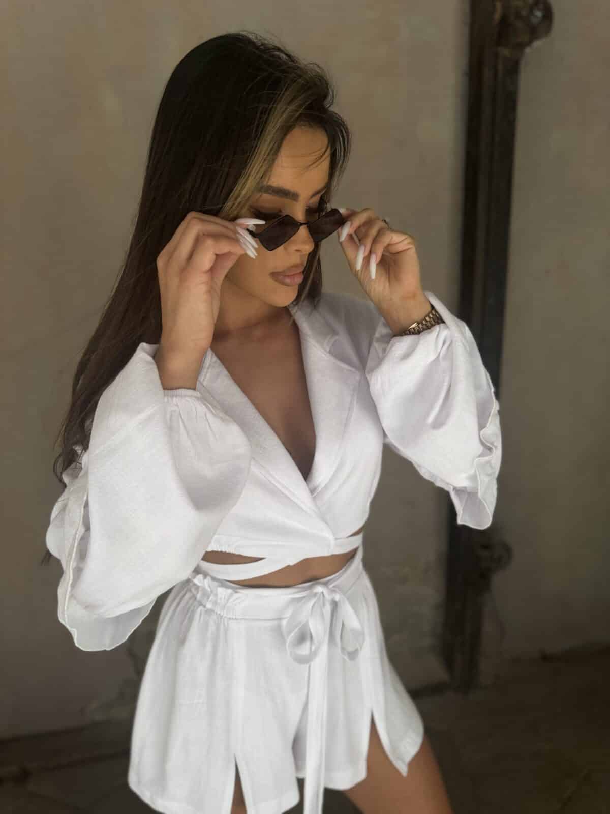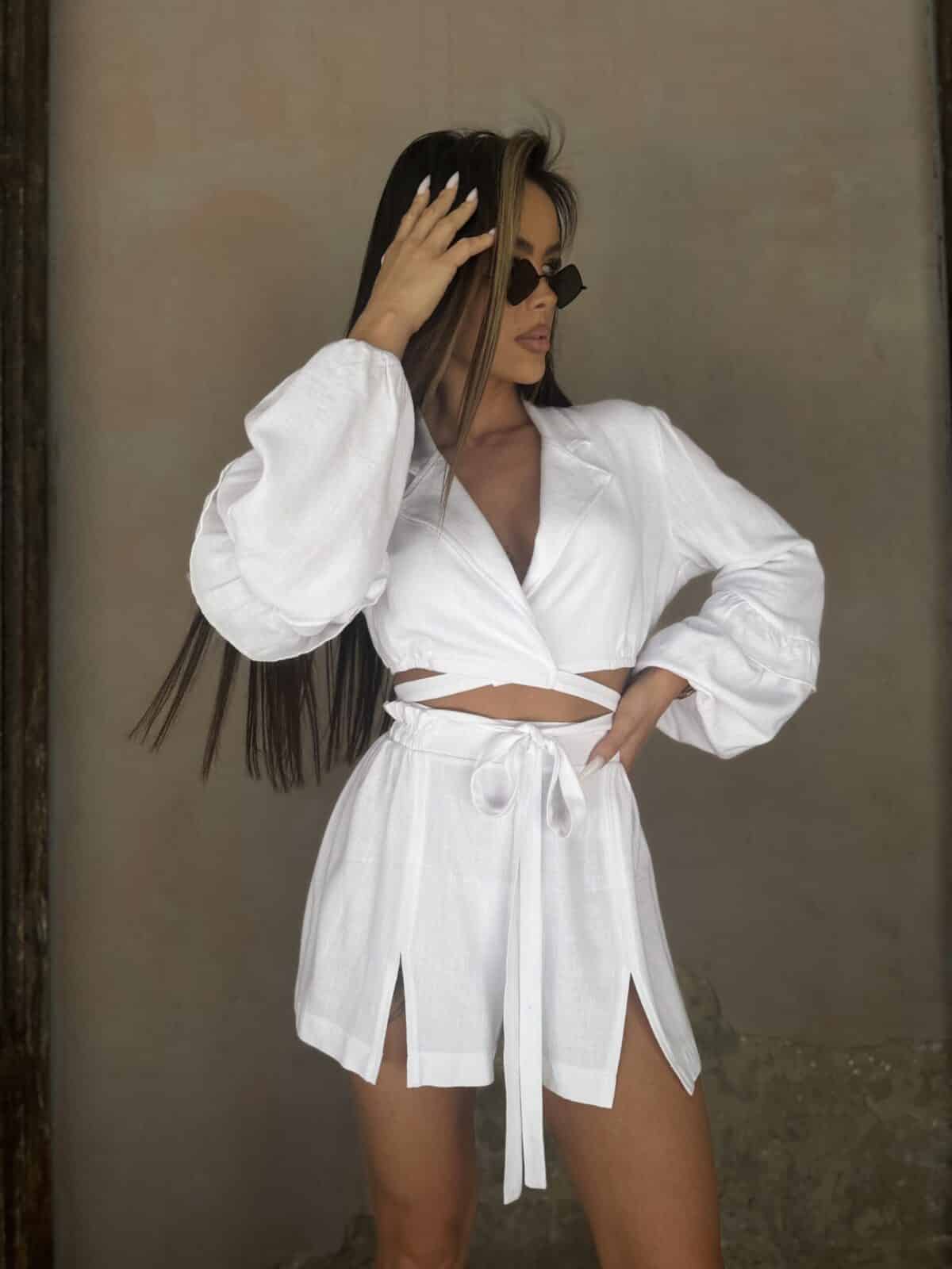 Dwuczęściowy damski komplet to harmonijne połączenie elegancji i komfortu. Koszula z bufiastymi rękawami z falbanką dodaje stylu i romantycznego uroku, podczas gdy wiązanie w talii podkreśla kobiecą sylwetkę. Wykonana z wysokiej jakości materiałów, gwarantuje wygodę noszenia przez cały dzień. Spodenki uzupełniają całość, tworząc zgraną stylizację idealną na różne okazje. Doskonałe na letnie dni, spotkania ze znajomymi czy wieczorne wyjścia. Ten komplet to nie tylko wybór modowy, ale także praktyczny, który z pewnością przyciągnie spojrzenia i podkreśli indywidualny styl noszącej. Made in Poland